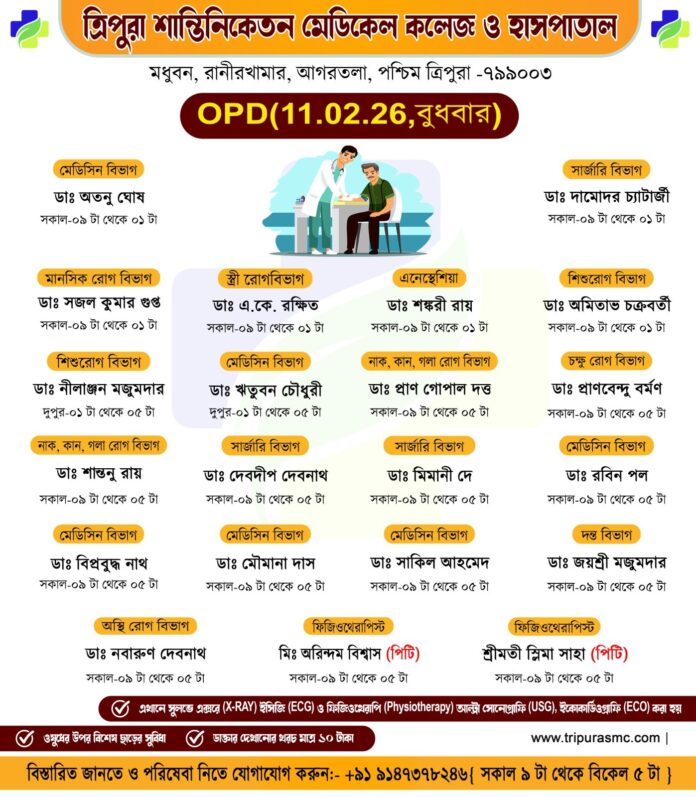সাধারণ মানুষকে সুলভে সুচিকিৎসা পৌঁছে দিতে প্রতিশ্রুতিবদ্ধ ত্রিপুরা শান্তিনিকেতন মেডিকেল কলেজ ও হাসপাতাল। আগামীকাল ১০টাকার বহির্বিভাগে (OPD) যে সমস্ত অভিজ্ঞ চিকিৎসকেরা পরিষেবা দেবে।