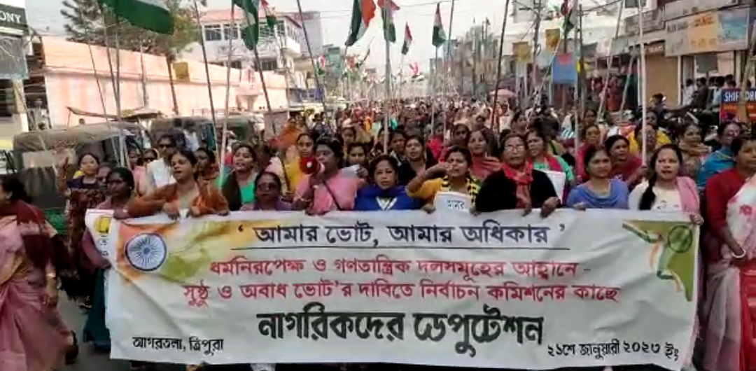 ২০২৩ ত্রিপুরা বিধানসভা নির্বাচনে রাজ্যের ক্ষমতাশীল বিজেপিকে পরাস্ত করার জন্য ইতিমধ্যে জোট করেছে বিরোধী দল কংগ্রেস এবং বামফ্রন্ট। সাধারণ মানুষের সামনে জোটের বার্তা ব্যাপক ভাবে ছড়িয়ে দিতে এদিন আগরতলায় এক যৌথ মিছিলের আয়োজন করা হয় উভয় দলের তরফে। “আমার ভোট আমার অধিকার ” শীর্ষক এদিনের এই মিছিলটি রাজধানী আগরতলার রবীন্দ্র শতবার্ষিকী ভবনের সামনে থেকে শুরু হয়ে শহরের বিভিন্ন রাস্তা পরিক্রমা করে। মিছিল থেকে আহবান জানানো হয় রাজ্যের সাধারণ মানুষের ভোটের অধিকার সুনিশ্চিত করতে হবে। সেদিন রাজধানী আগরতলার বিভিন্ন রাস্তা পরিক্রমা করে ও রাজ্য মুখ্য নির্বাচন আধিকারিক এর হাতে এই দাবিতে একটি ডেপুটেশন তুলে দেওয়া হয়। তবে এদিনের এই মিছিলে কোন রাজনৈতিক দলের পতাকা ব্যবহার করা হয়নি মিছিলে শুধুমাত্র ভারতের জাতীয় পতাকা হাতে নিয়ে সামিল হয়ে ছিলেন সকলে।