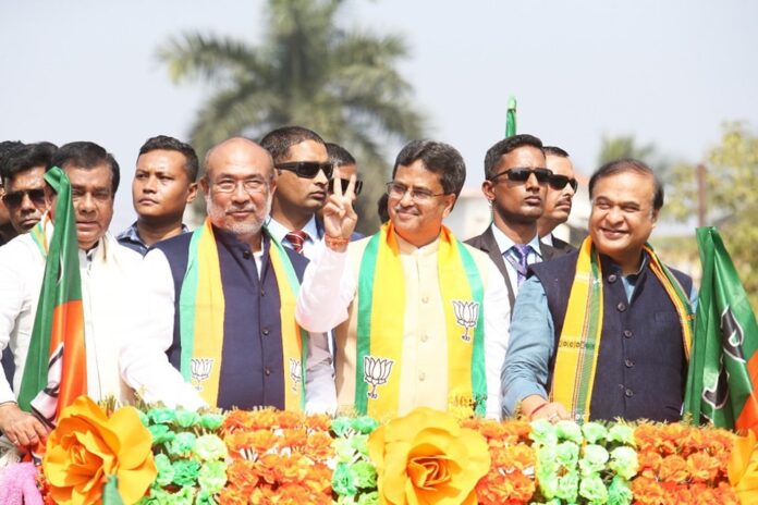 সোমবার এক রেলির মাধ্যমে গিয়ে টাউন বড় দোয়লি বিধানসভা কেন্দ্রের বিজেপি প্রার্থী তথা মুখ্যমন্ত্রী ডক্টর মানিক সাহা মনোনয়ন পত্র দাখিল করেন l এদিন উনার সাথে উপস্থিত ছিলেন আসামের মুখ্যমন্ত্রী হেমন্ত বিশ্ব শর্মা এবং মনিপুরের মুখ্যমন্ত্রী এন বীরেন সিং l সোমবার এক জমজমাট রেলির মাধ্যমে মনোনযন পত্র দাখিল করলেন ৮ টাউন বড় দেয়ালি বিধানসভা কেন্দ্রের বিজেপি দলের প্রার্থী তথা মুখ্যমন্ত্রী ডক্টর মানিক সাহা l এদিন রাজধানীর রবীন্দ্র শত বার্ষিকী ভবন প্রাঙ্গণ থেকে রেলি করে সদর মহকুমা শাসক তথা রিটার্নিং অফিসারের নিকট মনোনয়ন পত্র প্রদান করেন প্রার্থী l এদিন প্রার্থীর সঙ্গে উপস্থিত ছিলেন আসামের মুখ্যমন্ত্রী হেমন্ত বিশ্ব শর্মা এবং মনিপুরের মুখ্যমন্ত্রী এন বীরেন সিং সহ দলের স্থানীয় নেতৃত্ব রা l মুখ্যমন্ত্রীর রেলিতে দলে দলে ডাক, বাজনা , ব্যান্ড পার্টি থেকে শুরু করে আরো কত কিছু ছিল l মনোনয়ন জমা দেওয়ার পর এক সাক্ষাৎকারে আসামের মুখ্যমন্ত্রী হেমন্ত বিশ্ব শর্মা বলেন, গত বিধানসভা নির্বাচনে যত গুলি আসন পেয়ে ছিল, এর থেকে বেশি ই পাবেl সমস্যার কিছু নেই l এদিকে প্রার্থী তথা মুখ্যমন্ত্রী বলেন, আমরা জয়ের ব্যাপারে নিশ্চিত l আমরা আগামী দিন আই পি এফ টি র সঙ্গে জোট সঙ্গী হয়ে ক্ষমতায় আসব। এদিন রাজধানী যেন জন সমুদ্রের রূপ নেয় l এদিন মুখ্যমন্ত্রীর রেলিতে হাজার লোকের সমাগম ঘটে l