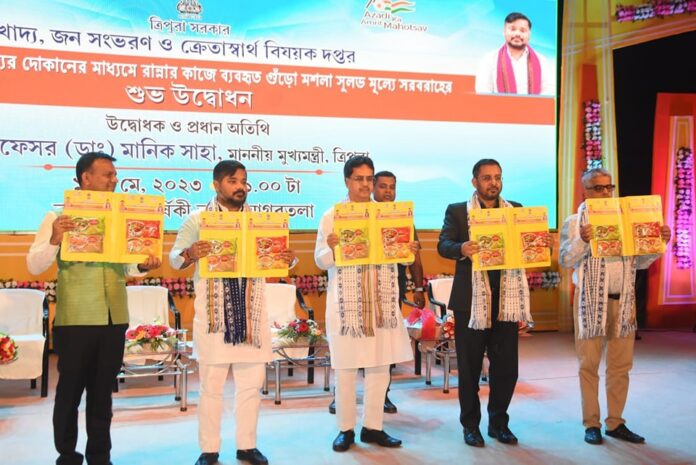 রাজ্যের গণবন্টন ব্যবস্থায় যুক্ত হলো নতুন পালক। এখন থেকে ভর্তুকিমূল্যে রেশন শপের মাধ্যমে প্যাকেটজাত গুঁড়ো মশলা তথা মরিচ, হলুদ, জিরা এবং ধনিয়া সরবরাহ করবে রাজ্য সরকার। মঙ্গলবার রাজধানী আগরতলার রবীন্দ্র শতবার্ষিকী ভবনের ১নং প্রেক্ষাগৃহে রাজ্যের মাননীয় মুখ্যমন্ত্রী প্রফেসর (ডাঃ) মানিক সাহার গৌরবোজ্জ্বল উপস্থিতিতে আনুষ্ঠানিক উদ্বোধন হল খাদ্য ও জনসংভরণ দপ্তরের উদ্যোগে সরকারী ন্যায্য মূল্যের দোকানের মাধ্যমে রান্নার কাজে ব্যবহৃত গুঁড়ো মশলা সুলভ মূল্যে সরবরাহ অনুষ্ঠান। এদিনের অনুষ্ঠানে উপস্থিত থেকে মঙ্গলদীপ প্রজ্জ্বলিত করে এর শুভ সূচনা করেন রাজ্যের মুখ্যমন্ত্রী ও খাদ্য দপ্তরের মন্ত্রী সুশান্ত চৌধুরী। এদিনের অনুষ্ঠানে মুখ্যমন্ত্রী বক্তব্য রাখতে গিয়ে বলেন প্রধানমন্ত্রী শ্রী নরেন্দ্র মোদীর মার্গদর্শনে, গণবন্টন ব্যবস্থাকে আরও শক্তিশালি করার মাধ্যমে, নিত্য প্রয়োজনীয় পণ্যসামগ্রী ভর্তুকিমূল্যে সমাজের অন্তিম ব্যক্তি পর্যন্ত পৌঁছে দিতে বদ্ধপরিকর সরকার। রবীন্দ্র শতবার্ষিকী ভবনে আয়োজিত এই অনুষ্ঠানে রাজ্যের বিভিন্ন প্রান্ত থেকে আগত রেশন ডিলারদের সম্বোধন করেন উপস্থিত অতিথিরা। তাছাড়া আজকের এই অনুষ্ঠানে অন্যান্য বিশিষ্ট অতিথিদের মধ্যে উপস্থিত ছিলেন, খাদ্য ও জনসংভরণ দপ্তরের বিশেষ সচিব রাভাল হেমেন্দ্র কুমার, অধিকর্তা নির্মল অধিকারী, সারা রাজ্য থেকে আগত ন্যায্য মূল্যের দোকানের ডিলারগণ, গুঁড়ো মশলা সরবরাহকারী সংস্থা লংতরাই এর কর্ণধার রতন দেবনাথ সহ অন্যান্য বিশিষ্ট অতিথিরা।।