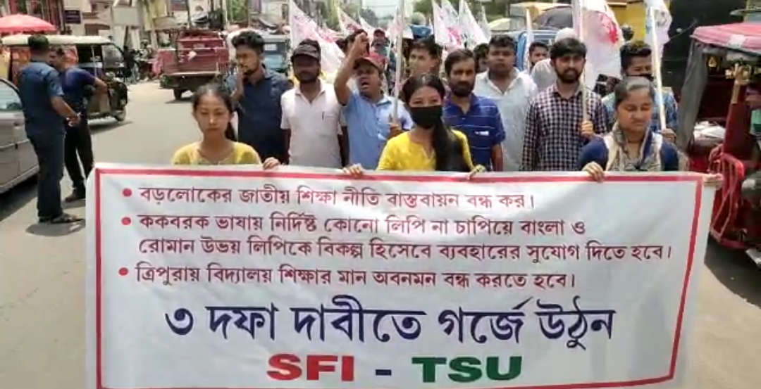শুক্রবার তিন দফা দাবি ভিত্তিতে ভারতের ছাত্র ফেডারেশন এবং উপজাতির ছাত্র সংগঠনের পক্ষ থেকে এক সুবিশাল মিছিল বের করা হয়, মিছিলটি ছাত্র যুব ভবনের সামনে থেকে বের হয়ে রাজধানীর বিভিন্ন পথ পরিক্রমা করে। মিছিল শেষে এস এফ আই রাজ্য সম্পাদক সন্দীপন দেব সংবাদ মাধ্যমকে জানান দেশের কেন্দ্রীয় সরকার জাতীয় শিক্ষানীতি চালু করার যে প্রচেষ্টা চালিয়ে যাচ্ছেন তা অবিলম্বে বন্ধ করা কেননা এই নীতি হচ্ছে বড়লোকের শিক্ষা নীতি তাছাড়া এই নীতি প্রণয়নের মাধ্যমে আরএসএস-এর যে ব্লু প্রিন্ট সেটাকে কার্যকরী করার প্রচেষ্টা কেবলমাত্র তার পাশাপাশি বিগত দিনে রতন লাল নাগ শিক্ষামন্ত্রী থাকাকালীন এই শিক্ষানীতি লাঘু করার যে প্রচেষ্টা সেটা রাজ্যের মুখ্যমন্ত্রী মানিক সাহার হাতে শিক্ষা দপ্তর থাকার পরও একইভাবে একই ধারাই চলছে। তার পাশাপাশি উপজাতি ছাত্রছাত্রীদের ককবরক ভাষা রোমান এবং বাংলা উভয় হরফে যেন শিক্ষা গ্রহণ করতে পারে তার সুব্যবস্থা করা এ দিনের মিছিলে ছাত্র-ছাত্রীদের উপস্থিতি ছিল লক্ষণীয়।