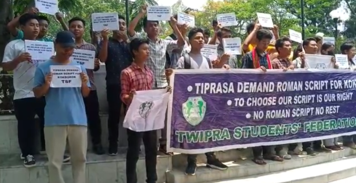 ককবরক ভাষাকে রোমান হরফে স্বীকৃতি দেওয়ার দাবিতে শুক্রবার আগরতলার সার্কেড হাউস সংলগ্ন গান্ধী মূর্তির পাদদেশের সামনে টিএসএফের পক্ষ থেকে এক প্রতিবাদ কর্মসূচি পালন করা হয়। এদিনের কর্মসূচি নিয়ে বলতে গিয়ে টিএসএফ সাধারণ সম্পাদক মনীষ দেববর্মা জানান আমাদের ভাষা আমাদের বিষয় আমাদের মত করে চয়ন করতে দিন, কেননা বিগত কিছুদিন পূর্বে রাজ্যের মুখ্যমন্ত্রী যে প্রেস বিজ্ঞপ্তি দিয়েছেন ককবরক ভাষা বাংলা হরফে লিখতে হবে তাতে আমরা সন্তুষ্ট নয় আমরা চাই রোমান হরফ, যদি আমাদের এই দাবি না মানা হয় তাহলে আগামী দিনের যে কর্মসূচি হাতে নেওয়া হবে তা বৃহত্তর থেকে বৃহত্তর হবে যা চির স্মরণীয় থাকবে। এই দিনের কর্মসূচিকে কেন্দ্র করে উপজাতি ছাত্র ফেডারেশনের ছাত্র-ছাত্রীদের উপস্থিতি ছিল লক্ষণীয়।