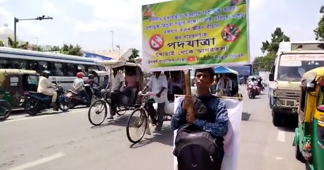 নেশা মুক্ত ত্রিপুরা গড়ে তোলার লক্ষ্যে কে সামনে রেখে পদে যাত্রা শুরু করলেন খোয়াই চেরি এলাকার বাসিন্দা পীযূষ কান্তি রায়। তিনি জানান এখন অব্দি এক হাজার কিলোমিটার পথ পদযাত্রা করে আগরতলায় আসেন। বর্তমানে যুবসমাজ নেশাগ্রস্ত কারণে ধ্বংসের পথে এগিয়ে যাচ্ছেন এবং সিরিনঞ্জ দিয়ে নেশা করার ফলে HIV রোগীর সংখ্যা প্রতিনিয়ত বৃদ্ধি পাচ্ছে পাশাপাশি রাজ্যের মুখ্যমন্ত্রী ডাক্তার মানিক সাহা আহবান করেন সারা ত্রিপুরা কে নেশা মুক্ত করার জন্য সকলকে এগিয়ে আসতে হবে। পীযূষ কান্তি রায় আরো জানান নেশা মুক্ত ত্রিপুরা কিংবা ভারতবর্ষ গড়া সরকারের পক্ষে একা সম্ভব নয় জনসাধারণকেও এগিয়ে আসতে হবে বর্তমানে যে যুবকরা নেশা সঙ্গে জড়িয়ে পড়ছে তাদেরকে সুস্থ জীবনে ফিরিয়ে আসার আহ্বান জানান পীযুষ কান্তি রায় পাশাপাশি প্রশাসনের কাছে আবেদন জানান যারা নেশা কারবারীর সঙ্গে যুক্ত তাদের বিরুদ্ধে কঠোর পদক্ষেপ নেওয়া হোক। পীযূষ কান্তি বিশ্বাস নামে ওই যুবক নেশা মুক্ত আহ্বানকে সামনে রেখে আগামী দিনে আগরতলা থেকে দিল্লি পর্যন্ত পদযাত্রা করার আশা প্রকাশ করেন। সোমবার আগরতলা স্বামী বিবেকানন্দ ময়দান এলাকায় থেকে প্রতিক্রিয়া ব্যক্ত করেন।