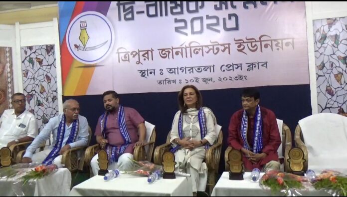 ত্রিপুরার জার্নালিস্ট ইউনিয়নের দ্বিবার্ষিক সম্মেলনে সাংবাদিকদের নীতিমালার পাঠ দিলেন মন্ত্রি সুশান্ত চৌধুরী। পাশাপাশি তিনি জানান কর্মরত সাংবাদিকদের স্বাস্থ্য বীমা প্রদানের কাজ প্রায় সমাপ্ত। এই দ্বিভাষিক সম্মেলনে উপস্থিত ছিলেন অল ইন্ডিয়া জার্নালিস্ট ইউনিয়নের মহাসচিব তথা বিশ্ব সংস্থার সহ সভাপতি সাবিনা ইন্দ্রজিৎ এবং অল ইন্ডিয়া জার্নালিস্ট ইউনিয়নের রাষ্ট্রীয় সভাপতি গীতার্থ পাঠক। ত্রিপুরা জার্নালিস্ট ইউনিয়ন বা টি জে ইউ’র দ্বিবার্ষিক রাজ্য সম্মেলন শনিবার আগরতলা প্রেস ক্লাবে অনুষ্ঠিত হয়। এই রাজ্য সম্মেলনের উদ্বোধন করেন রাজ্যের পর্যটন ও অন্যান্য দপ্তরের মন্ত্রী সুশান্ত চৌধুরী। উদ্বোধনী অনুষ্ঠানে উপস্থিত ছিলেন অল ইন্ডিয়া জার্নালিস্ট ইউনিয়নের সভাপতি গীতা অর্থ পাঠক, সংগঠনের রাষ্ট্রীয় মহাসচিব তথা বিশ্ব সংবাদ সংস্থার সহ-সভাপতি সাবিনা ইন্দ্রজিৎ, জার্নালিস্ট ইউনিয়নের সর্বভারতীয় সম্পাদক প্রণব সরকার, আগরতলা প্রেস ক্লাবের সভাপতি জয়ন্ত ভট্টাচার্য প্রমূখ। এদিন উদ্বোধনী অনুষ্ঠানে বক্তব্য রাখতে গিয়ে মন্ত্রী সুশান্ত চৌধুরী বলেন সংবাদ ভবন বা হাউস কে পরিবারের মতো করে ভাবতে হবে সাংবাদিকদের ।তাদের মনে রাখতে হবে এই হাউজ তাকে লেখার সম্মান দিয়েছে। সাংবাদিককে মনে রাখতে হবে গণতন্ত্রের চতুর্থ স্তম্ভের দায়িত্ব তিনি সঠিকভাবে পালন করছেন কিনা।মন্ত্রী সুশান্ত চৌধুরী আরো জানান রাজ্যে কর্মরত সাংবাদিকদের বিভিন্ন সমস্যা সমাধানে রাজ্য সরকার সচেষ্ট।সাংবাদিকদের স্বাস্থ্য বীমা প্রদান সংক্রান্ত বিষয়ের কাজ প্রায় ৯০ শতাংশ শেষ হয়ে গেছে। গোটা বিষয়টি এখন মুখ্যমন্ত্রী দেখছেন।এদিন দ্বিবার্ষিক সম্মেলনের শুরুতেই ত্রিপুরা জার্নালিস্ট ইউনিয়নের বার্ষিক প্রতিবেদন পাঠ করেন সাধারণ সম্পাদক প্রণব সরকার ।বক্তব্যে তিনি রাজ্যের সমস্ত সাংবাদিকদের ঐক্যবদ্ধ থাকার আহ্বান জানান।