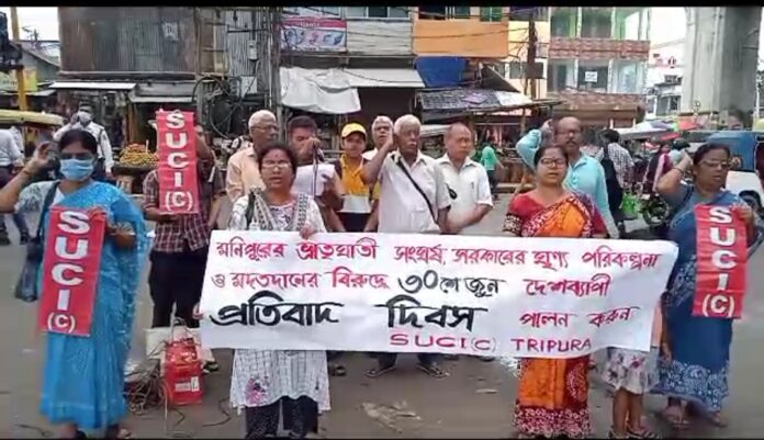 গত প্রায় দুই মাস ধরে পার্শ্ববর্তী রাজ্য মনিপুরে হিংসাত্মক সাম্প্রদায়িক আগুনে জ্বলছে। ইতিমধ্যেই হিংসাত্মক ঘটনায় বহু লোকের প্রানাহানি ঘটেছে। ধ্বংস হয়েছে বহু বাড়িঘর। যা এখনো অব্যাহত রয়েছে। মনিপুরে সাম্প্রদায়িক হিংসাত্মক ঘটনায় মানুষ আতঙ্কে থাকলেও কেন্দ্রীয় সরকার অনেকটা নীরব দর্শকের ভূমিকা অবতীর্ণ। তাদের এই ভূমিকার তীব্র প্রতিবাদ জানায় এসইউসিআই কমিউনিস্ট। তাদের অভিযোগ কেন্দ্র ও রাজ্য বিজেপি সরকারের পরোক্ষ মদতেই চলছে এই হিংসাত্মক ঘটনা। তাই কেন্দ্র ও মনিপুর সরকারের ভূমিকার তীব্র নিন্দা জানিয়ে মনিপুরের সাধারণ মানুষের মূল্যবান জীবন রক্ষার জন্য সাম্প্রদায়িক জলন্ত পরিস্থিতিকে শক্ত হাতে সরকারকে নিয়ন্ত্রণ করার দাবি জানায় দল। একই সাথে এসইউসিআই মণিপুরের শান্তিপ্রিয় সকল অংশের জনগণের প্রতি আহবান রাখে নিজেদের ঐক্যকে আরো সংহত করে বিচ্ছিন্নতাবাদী জাতীয়তাবাদী চরম সাম্প্রদায়িক শক্তি গুলিকে জনগণ থেকে বিচ্ছিন্ন করার মধ্য দিয়ে জ্বলন্ত দাবি গুলির ভিত্তিতে ঐক্যবদ্ধ গণতান্ত্রিক আন্দোলন গড়ে তোলার। আর এই আহ্বান ও দাবীকে সামনে রেখে দলের সর্বভারতীয় নেতৃত্ব সিদ্ধান্ত নেয় মণিপুরের এই ভয়াবহ রক্তপাতের পেছনে সরকারের ষড়যন্ত্রমূলক ভূমিকার বিরুদ্ধে ৩০শে জুন দেশব্যাপী প্রতিবাদ দিবস পালন করার। সর্বভারতীয় সিদ্ধান্ত অনুযায়ী শুক্রবার আগরতলাতেও দলের রাজ্য সাংগঠনিক কমিটির উদ্যোগে অনুষ্ঠিত হয় প্রতিবাদ সভা। রাজধানীর বটতলায় আয়োজিত প্রতিবাদ সভায় অবিলম্বে মণিপুরে শান্তি ও সম্প্রীতি ফিরিয়ে আনতে কেন্দ্র ও মনিপুর সরকারের নিকট দাবি জানিয়ে বক্তব্য রাখেন দলের রাজ্য সাংগঠনিক কমিটির সম্পাদক অরুণ ভৌমিক।