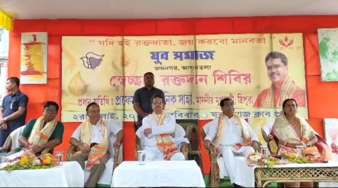 রবিবার রবীন্দ্র নজরুল সন্ধ্যা এবং রক্তদান শিবিরের আয়োজন করলো আগরতলার যুবসমাজ ক্লাব। সকালে রক্তদান শিবিরের উদ্বোধন করেন মুখ্যমন্ত্রী ডাক্তার মানিক সাহা ।অনুষ্ঠানে উপস্থিত ছিলেন মেয়র দীপক মজুমদার, এলাকার কর্পোরেটর তথা মেয়র ইন কাউন্সিলর তুষার কান্তি ভট্টাচার্য সহ অন্যান্যরা। এদিন যুবসমাজ ক্লাব আয়োজিত রক্তদান শিবিরে রক্তদাতাদের সাথে কথা বলেন মুখ্যমন্ত্রী ।তাদের অভিনন্দন জানান তিনি। পড়ে অনুষ্ঠানে বক্তব্য রাখতে গিয়ে মুখ্যমন্ত্রী বলেন ,স্বাস্থ্য পরিষেবা রাজ্য সরকারের অন্যতম প্রধান অগ্রাধিকারের ক্ষেত্র ।এই লক্ষ্যকে সামনে রেখে কাজ করে চলেছে স্বাস্থ্য দপ্তর ।মুখ্যমন্ত্রী আরও জানান প্রতি সপ্তাহে মুখ্যমন্ত্রী সমীপেষু নামক একটি অনুষ্ঠান তিনি করে চলছেন। এই অনুষ্ঠানে প্রায় নিরানব্বই শতাংশ জনগণই স্বাস্থ্য পরিষেবার সুযোগ পেতে আবেদন নিয়ে হাজির হন। তাই সংশ্লিষ্টদের কাছে পরিষেবা পৌঁছে দিতে প্রধানমন্ত্রী আয়ুষ্মান ভারত প্রকল্পের মত একটি প্রকল্প হাতে নেওয়া যায় কিনা সেই বিষয়টি নিয়ে চিন্তাভাবনা করা শুরু করেছে রাজ্য সরকার। তাছাড়া এদিন আগরতলা পৌর নিগমের ৩৪ নম্বর ওয়ার্ডের অন্তর্গত যুব সমাজ জলাশয় এর সৌন্দর্যায়নের কাজের ভিত্তি প্রস্তর স্থাপন করেন মুখ্যমন্ত্রী ডাক্তার মানিক সাহা। আসন্ন দূর্গা পূজার আগেই যুব সমাজ জলাশয়ের সৌন্দর্য বৃদ্ধির উদ্যোগ গ্রহণ করেছে আগরতলা পৌর নিগম কর্তৃপক্ষ বলে জানা গিয়েছে। এদিনের অনুষ্ঠানে এলাকাবাসীর উপস্থিতি ছিল লক্ষণীয়।