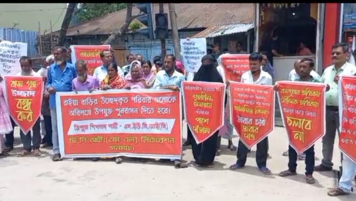 উদয়পুরের রাইয়াবাড়ি এলাকায় দীর্ঘদিন ধরেই পূর্বতন সরকারের অলিখিত পুনর্বাসনের ভিত্তিতে সরকারি জমিতে বসবাস করছিলেন বেশ কয়েকটি সংখ্যালঘু পরিবার। কিন্তু গত ২৫ শে মে সরকারি জমি উচ্ছেদ করার লক্ষ্যে রাজ্য প্রশাসন ভুলডোজার চালিয়ে পরিবার গুলির বাড়ি ঘর সহায় সম্পত্তি ধ্বংস করে দেয়। এতে করে স্বাভাবিকভাবেই নিঃস্ব হয়ে পড়ে সংখ্যালঘু সাতটি পরিবারের লোকেরা। এই ঘটনায় প্রশাসনের ভূমিকা নিয়ে প্রশ্ন তুলে সোচ্চার হোন বিরোধী রাজনৈতিক দলগুলি। কিন্তু এরপরেও প্রশাসনিকভাবে অসহায় পরিবার গুলির জন্য কোন ধরনের উদ্যোগ নেই। তাই এবার রাইয়াবাড়ির উচ্ছেদকৃত পরিবারগুলিকে অবিলম্বে উপযুক্ত পুনর্বাসন দেওয়ার দাবিতে রাস্তায় নামল ত্রিপুরা পিপলস পার্টি, এস ইউ সি আই সি এবং সিপিআইএনএল লিবারেশন গণমঞ্চ। শুক্রবার আগরতলা ওরিয়েন্ট চৌমুনিতে দাবি আদায়ের লক্ষ্যে এই তিন সংগঠনের কর্মীরা ক্ষতিগ্রস্ত পরিবার গুলির সদস্যদের নিয়ে বিক্ষোভ কর্মসূচিতে সামিল হয়। যার নেতৃত্ব দেন সিপিআইএম এল এর রাজ্য সম্পাদক পার্থ কর্মকার। এদিন তিনি জানান শুক্রবার থেকেই শুরু হয়েছে রাজ্যের বিধানসভার বাজেট অধিবেশন। আর এই অধিবেশনে ক্ষতিগ্রস্ত পরিবার গুলিকে পুনর্বাসনের দাবিতে সোচ্চার হওয়ার জন্য বিরোধী দলের সদস্যদের কাছে আগাম চিঠি দেওয়া হয়েছে। তাই অধিবেশনে যাতে বিষয়টি নিয়ে আলোচনা সাপেক্ষে প্রয়োজনীয় উদ্যোগ নেওয়া হয়, তার জন্য বিধায়কদের দৃষ্টি আকর্ষণ করতেই এই বিক্ষোভ কর্মসূচির আয়োজন।