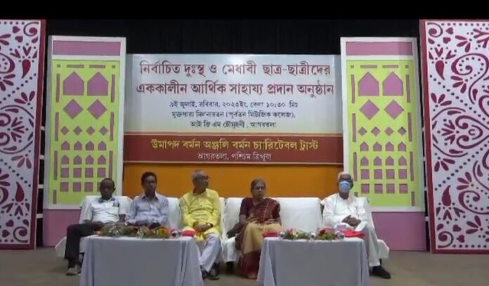 রাজ্যের দুস্থ ও মেধাবী ছাত্র-ছাত্রীদের পাশে এবারো দাঁড়ালো উমাপদ বর্মন অঞ্জলি বর্মন চ্যারিটেবল ট্রাস্ট। আগরতলা মুক্তধারা অডিটোরিয়ামে এক অনুষ্ঠানের মধ্য দিয়ে রাজ্যের বিভিন্ন প্রান্তের ৫০ জন দুস্থ মেধাবী ছাত্র-ছাত্রীদের হাতে তুলে দেওয়া হয় এককালীন আর্থিক সাহায্য। একই মঞ্চে আরো ১০ জন ছাত্রছাত্রীরাতে চন্দ্র লাল বর্মনের পরিবার তুলে দিলেন আর্থিক অনুদান। দুস্থ মেধাবী ছাত্রছাত্রীদের হাতে এককালীন আর্থিক সাহায্য প্রদান অনুষ্ঠানে প্রধান অতিথি হিসেবে উপস্থিত ছিলেন রাজ্যের প্রাক্তন মুখ্যমন্ত্রী মানিক সরকার।প্রতিবছরের মতো এবারও রাজ্যের একাংশ দুস্থ ও মেধাবী ছাত্রছাত্রীদের পাশে থাকার ব্রত পালনের লক্ষ্যে এককালীন আর্থিক অনুদান প্রদান করল উমাপদ বর্মন অঞ্জলি বর্মন চ্যারিটেবল ট্রাস্ট। রবিবার আগরতলা মুক্তধারা অডিটোরিয়ামে এক অনুষ্ঠানের মধ্য দিয়ে রাজ্যের বিভিন্ন প্রান্ত থেকে বাছাই করা ৫০ জন দুস্থ ও মেধাবী ছাত্রছাত্রীর হাতে তুলে দেওয়া হয় এককালীন আর্থিক সাহায্য হিসেবে মাথাপিছু পাঁচ হাজার টাকা। একই মঞ্চে এদিন চন্দ্রলাল বর্মনের পরিবারের তরফেও আরো ১০ জন দুস্থ মেধাবী ছাত্রছাত্রীর হাতে তুলে দেওয়া হয় পাঁচ হাজার টাকা করে। মোট ৬০জন দুস্থ মেধাবী ছাত্র-ছাত্রী এদিন পেলেন এককালীন আর্থিক অনুদান। এদিনের এই আর্থিক সাহায্য প্রদান অনুষ্ঠানে প্রধান অতিথি হিসেবে উপস্থিত ছিলেন রাজ্যের প্রাক্তন মুখ্যমন্ত্রী মানিক সরকার। এছাড়াও ছিলেন সাহিত্যিক মানস দেববর্মন, শিক্ষাবিদ আলপনা সেনগুপ্ত সহ আরো বিশিষ্টজনেরা। এদিনের এই অনুষ্ঠানে বক্তব্য রাখতে গিয়ে রাজ্যের প্রাক্তন মুখ্যমন্ত্রী মানিক সরকার উমাপদ বর্মন অঞ্জলি বর্মন চ্যারিটেবল ট্রাস্টের ভূয়ষী প্রশংসা করে বলেন, শুধুমাত্র কেন উমাপদ বর্মন অঞ্জলি বর্মন চ্যারিটেবল ট্রাস্টই দায়িত্ব পালন করবে। বাকিরা কেন এগিয়ে আসবে না। অনেকেরই তো মা বাবা চলে গেছে। তারা চলে যাবার সময় ছেলেমেয়েদের জন্য কিছু না কিছু রেখে গেছেন। উমাপদ বর্মন ও অঞ্জলি বর্মন তাদের স্মৃতি ধরে রাখার জন্য যে ট্রাস্ট তৈরি করে গেছেন, এরকম কাজে কেন সবাই নিজেকে যুদ্ধ করবে না। তিনি আরো বলেন, বর্তমান প্রজন্মের ছেলেমেয়েরা অনেকেই ডাক্তার ইঞ্জিনিয়ার হতে চায়। কিন্তু বহু ডাক্তার ইঞ্জিনিয়ারই বাড়িতে ছেলের সাথে নাতি নাতনির সাথে থাকার সুযোগ পাচ্ছেন না। যা খুবই দুর্ভাগ্যের ঘটনা। এরকম ব্যক্তিদের দেখভাল করার জন্য এই ট্রাস্ট একটি প্রতিষ্ঠান গঠন করেছে। এই প্রতিষ্ঠানে এখন অনেকেই সহযোগিতার হাত বাড়িয়ে দিচ্ছে।