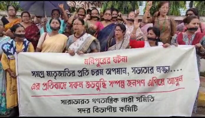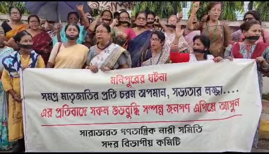 মনিপুরের ঘটনা সমগ্র মাতৃ জাতির প্রতি চরম অপমান, সভ্যতার লজ্জা। দুইজন মহিলাকে বিবস্ত্র অবস্থায় প্রকাশ্যে হাঁটানো এবং পরবর্তী সময়ে গণধর্ষণের ঘটনায় তোলপাড় গোটা দেশ। দেশের সর্বত্র চলছে এই লজ্জাজনক ঘটনার প্রতিবাদে বিক্ষোভ কর্মসূচি। ব্যতিক্রম নয় ত্রিপুরাও। রাজ্য প্রতিদিন কোন না কোন সংগঠনের উদ্যোগে জঘন্যতম এই ঘটনার প্রতিবাদে সোচ্চার হচ্ছেন সাধারণ মানুষ। এবার এই ঘটনার প্রতিবাদ জানিয়ে রাস্তায় নামলেন বামপন্থী নারী সংগঠন সারা ভারত গণতান্ত্রিক নারী সমিতির কর্মীরা। সংগঠনের রাজ্য কমিটির সিদ্ধান্ত মোতাবেক সোমবার আগরতলা উত্তর গেইট সংলগ্ন এলাকায় সদর বিভাগীয় কমিটির উদ্যোগে অনুষ্ঠিত হয় প্রতিবাদ বিক্ষোভ কর্মসূচি। সংগঠনের কর্মীরা মুখে কালো কাপড় বেঁধে মনিপুরে সংঘটিত ঘটনার তীব্র প্রতিবাদ জানান। একই সাথে এদিনের এই প্রতিবাদ বিক্ষোভ কর্মসূচি থেকে নারী সমিতির কর্মীরা আওয়াজ তুলেন মনিপুরের মুখ্যমন্ত্রীর পদত্যাগের। এদিনের এই প্রতিবাদ বিক্ষোভ কর্মসূচির নেতৃত্ব দেন নারী সমিতির কেন্দ্রীয় নেতৃত্ব রমা দাস। উপস্থিত ছিলেন সংগঠনের রাজ্য সম্পাদিকা স্বপ্না দত্ত সহ অন্যান্য নেতৃত্ব। এই কর্মসূচি প্রসঙ্গে এদিন রমা দাস বলেন, মনিপুরে প্রকাশিত সংবাদ ছাড়াও আরো বহু ঘটনা লুকিয়ে রয়েছে। মহিলাদের উপর নানাভাবে অত্যাচার চলছে সেখানে। রাষ্ট্রীয় পুলিশের যোগসাজসেই এধরনের ঘটনা সংঘটিত। মনিপুরে সংঘটিত ঘটনায় সারাদেশের মানুষ বিচলিত। এমনকি দেশের সুপ্রিম কোর্ট পর্যন্ত বলেছে মনিপুর সরকার যদি অভিলম্বে এধরনের ঘটনা প্রতিরোধ না করে তাহলে প্রয়োজনে সুপ্রিম কোর্ট হস্তক্ষেপ করবে।