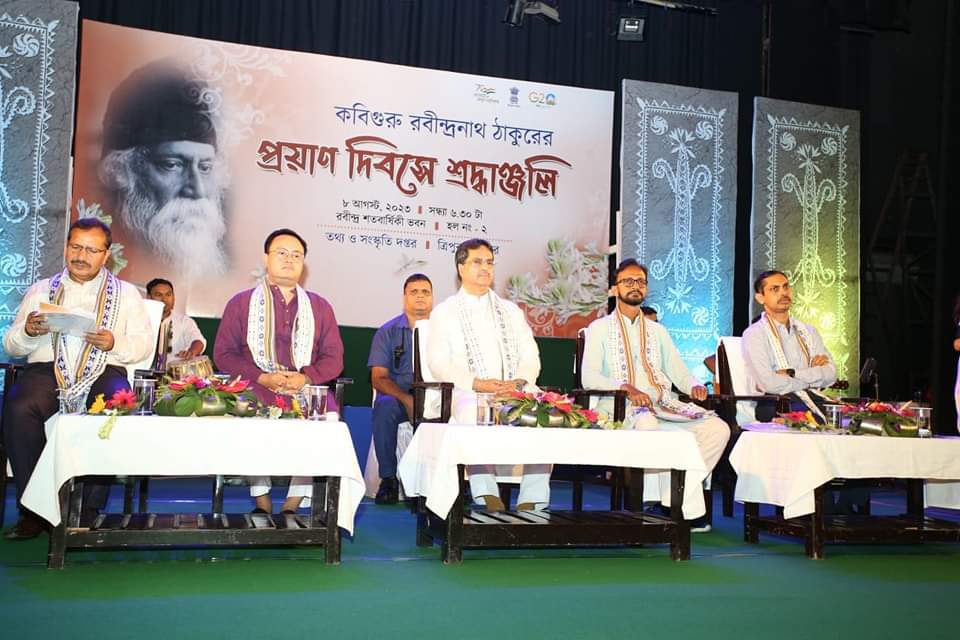 রবীন্দ্রনাথ ঠাকুর ভারতীয় সংস্কৃতির অন্যতম প্রাণ পুরুষ। রবীন্দ্রনাথ ঠাকুরের ভারতীয় সংস্কৃতিবোধ, চিন্তা-চেতনা ও দেশপ্রেম আগামী প্রজন্মের কাছে আরও বেশী করে নিয়ে যেতে হবে। তিনি জীবনের প্রতিটি ক্ষেত্রে বিরাজমান। আজ রবীন্দ্র শতবার্ষিকী ভবনে রবীন্দ্রনাথ ঠাকুরের প্রয়াণ দিবসে আয়োজিত শ্রদ্ধাঞ্জলি অনুষ্ঠানে মুখ্যমন্ত্রী প্রফেসর (ডা.) মানিক সাহা একথা বলেন। তথ্য ও সংস্কৃতি দপ্তর আয়োজিত শ্রদ্ধাঞ্জলি অনুষ্ঠানে সম্মানিত অতিথি হিসেবে উপস্থিত ছিলেন তথা ও সংস্কৃতি দপ্তরের সচিব ড. প্রদীপ কুমার চক্রবর্তী, বিশেষ অতিথি হিসেবে উপস্থিত ছিলেন লেখক ও গবেষক ড. সৌরিশ দেববর্মা। সভাপতিত্ব করেন রাজ্যভিত্তিক সাংস্কৃতিক উপদেষ্টা কমিটির ভাইস চেয়ারম্যান সুব্রত চক্রবর্তী। অনুষ্ঠানে সবাইকে স্বাগত জানিয়ে বক্তব্য রাখেন তথ্য ও সংস্কৃতি দপ্তরের অধিকর্তা বিম্বিসার ভট্টাচার্য। অনুষ্ঠানে মুখ্যমন্ত্রী প্রফেসর (ডা.) মানিক সাহা বলেন, ২৫শে বৈশাখ রবীন্দ্রনাথ ঠাকুরের জন্মদিন এবং ২২শে শ্রাবণ প্রয়াণ দিবস আমরা সবসময়ই মনে রাখি। আজ এই দিনে তিনি প্রয়াত হয়েছেন ঠিকই কিন্তু কবিগুরু এখনও আমাদের কাছে সমান প্রাসঙ্গিক। সাহিত্য ও সংস্কৃতির প্রতিটি শাখাতেই রবীন্দ্রনাথের ছিল অবাধ বিচরণ। সঙ্কটকালে তিনি এখনও আমাদের উত্তরণের দিশা দেখান। মুখ্যমন্ত্রী বলেন, দেশবাসীকে সুদৃঢ় বন্ধনে আবদ্ধ করতে তিনি রাখিবন্ধন উৎসব শুরু করেছিলেন। ১৯১৯ সালে জালিয়ানওয়ালাবাগে ইংরেজ শাসকদের গণহত্যার প্রতিবাদে রবীন্দ্রনাথ ঠাকুর নাইট উপাধি ত্যাগ করেছিলেন। ত্রিপুরার সাথে কবিগুরুর নিবিড় সম্পর্কের কথাও তিনি আলোচনায় উল্লেখ করেন। অনুষ্ঠানে সম্মানিত অতিথি তথ্য ও সংস্কৃতি দপ্তরের সচিব প্রদীপ কুমার চক্রবর্তী বলেন, কবির সৃষ্টি অসীম। তাঁর সৃষ্টি আমাদের চিন্তা চেতনাকে ছুঁয়ে আছে। তিনি আশা প্রকাশ করেন রবীন্দ্র রচনা অনুবাদ হয়ে আরও বেশী মানুষের কাছে পৌঁছে যাবে। অনুষ্ঠানে অন্যান্যদের মধ্যে বক্তব্য রাখেন লেখক ও গবেষক ড. সৌরিশ দেববর্মা ও অনুষ্ঠানের সভাপতি সুব্রত চক্রবর্তী। উদ্বোধনী অনুষ্ঠানের পর সঙ্গীত, নৃত্যের মাধ্যমে কবিগুরুর প্রতি শ্রদ্ধা জ্ঞাপন করা হয়। অনুষ্ঠানের শুরুতে অতিথিগণ রবীন্দ্রনাথের প্রতিকৃতিতে পুষ্পার্ঘ অর্পণ করে শ্রদ্ধা জ্ঞাপন করেন।