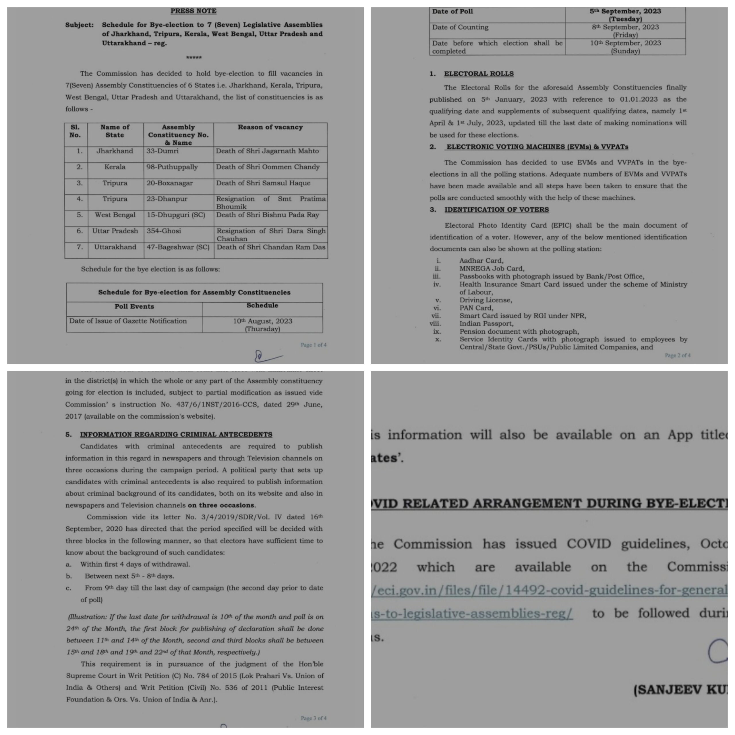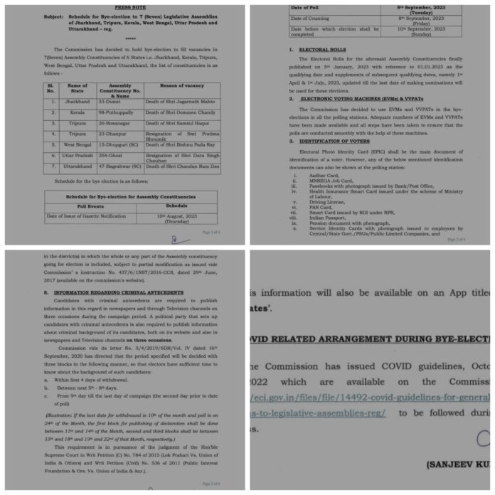ভারতের নির্বাচন কমিশন আজ ২০-বক্সনগর ও ২৩-ধনপুর বিধানসভা কেন্দ্রের শূন্য আসনে উপনির্বাচনের নির্ঘন্ট ঘোষণা করেছে। নির্ঘন্ট অনুযায়ী এই দুটি শূন্য আসনে উপনির্বাচন অনুষ্ঠিত হবে আগামী ৫ সেপ্টেম্বর, ২০২৩ (মঙ্গলবার)। ভোট গণনা করা হবে ৮ সেপ্টেম্বর, ২০২৩ (শুক্রবার)। রাজ্য নির্বাচন দপ্তর থেকে এক প্রেস রিলিজে জানানো হয়েছে, এই দুটি আসনের উপনির্বাচনের জন্য বিজ্ঞপ্তি জারি করা হবে আগামী ১০ আগস্ট, ২০২৩ (বৃহস্পতিবার)। মনোনয়নপত্র জমা দেওয়ার শেষ তারিখ ১৭ আগস্ট, ২০২৩ (বৃহস্পতিবার)। মনোনয়নপত্র পরীক্ষা করা হবে ১৮ আগস্ট, ২০২৩ (শুক্রবার)। মনোনয়নপত্র প্রত্যাহারের শেষ দিন ২১ আগস্ট, ২০২৩ (সোমবার)। আগামী ১০ সেপ্টেম্বর, ২০২৩ (রবিবার)-এর মধ্যে নির্বাচনী প্রক্রিয়া শেষ করা হবে।