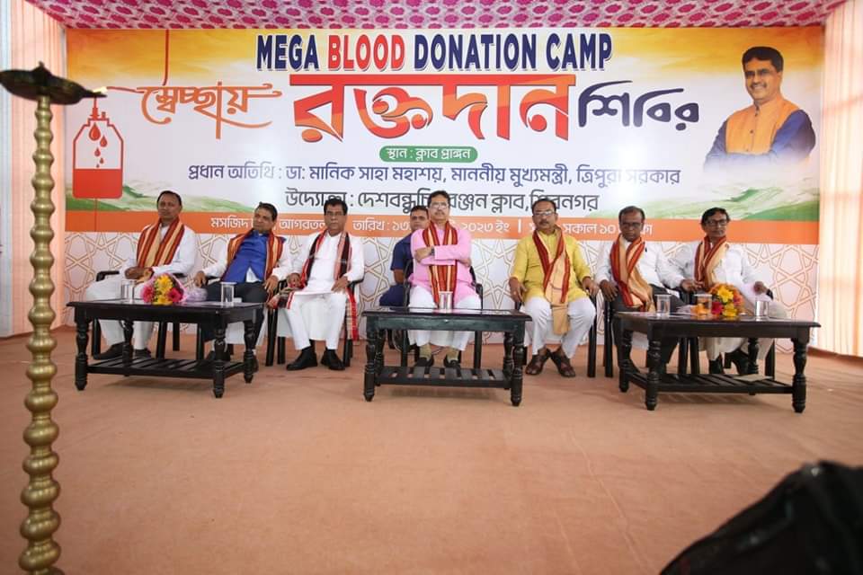 রাজ্যে রক্তের ঘাটতি পূরণে রাজ্যের মুখ্যমন্ত্রীর আহবানে সাড়া দিয়ে রক্তদানের মত মহৎ কর্মসূচিতে এগিয়ে এসেছেন বিভিন্ন ক্লাব, সংগঠন ও সংস্থা। যার ফলে রাজ্যের রক্তের ঘাটতি কিছুটা হলেও পূরণ হয়েছে, মুখ্যমন্ত্রীর সেই আহ্বানে সাড়া দিয়ে এবার রক্তদানে এগিয়ে এসেছেন দেশবন্ধু চিত্তরঞ্জন ক্লাব। এদিনের রক্তদান শিবিরে প্রধান অতিথি হিসেবে উপস্থিত ছিলেন রাজ্যের মুখ্যমন্ত্রী অধ্যাপক ডাক্তার মানিক সাহা, বিশেষ অতিথি হিসেবে উপস্থিত ছিলেন আগরতলা পুর নিগমের মেয়র দীপক মজুমদার, এলাকার বিধায়ক গোপাল চন্দ্র রায় ও বিশিষ্ট সমাজসেবক তথা প্রদেশ বিজেপি সভাপতি রাজীব ভট্টাচার্য। এ দিনের রক্তদান শিবিরে বক্তব্য রাখতে গিয়ে মুখ্যমন্ত্রী বলেন মানুষের বিভিন্ন সমস্যাই যদি মানুষ এগিয়ে আসে তাহলে সমাজের চেহারায় পাল্টে যাবে এবং দেশবন্ধু চিত্তরঞ্জন ক্লাব শুধু দুর্গা পূজার মধ্যেই সীমাবদ্ধ নয় বিভিন্ন সামাজিক কর্মসূচির মধ্য দিয়ে নিজেদেরকে প্রতিষ্ঠিত করেছেন যা দেখে অন্যান্য ক্লাব ও সামাজিক প্রতিষ্ঠান অনুপ্রাণিত হয়ে এ ধরনের সামাজিক কর্মসূচিতে এগিয়ে আসছেন তা ছাড়া এমন অনেক রয়েছেন যারা রক্ত দিতে ভয় পান তারা মনে করে যে রক্ত দিলে তাদের শারীরিক অবস্থা খারাপ হবে কিন্তু এটা সম্পূর্ণ ভুল ধারণা রক্ত দিলে শরীর ভালো থাকে হার্ট অ্যাটাকের মত ঘটনা থেকে রেহাই পাওয়া যায়, তাই সমাজের সকল স্তরের মানুষ যেন এই মহৎ কর্মসূচিতে এগিয়ে আসেন তার আহ্বান রাখেন। এদিকে রক্তদান শিবিরে রক্ত দাতাদের মধ্যে ব্যাপক উৎসাহ পরিলক্ষিত হয়।