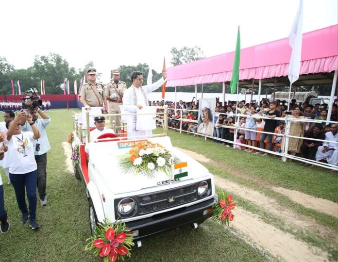 সারা দেশের সাথে রাজ্যেও উৎসাহ ও উদ্দীপনার মধ্য দিয়ে পালিত হয় ৭৭তম স্বাধীনতা দিবস। মঙ্গলবার সরকারিভাবে মূল অনুষ্ঠানটি হয় আগরতলা আসাম রাইফেলস ময়দানে। সেখানে আনুষ্ঠানিকভাবে জাতীয় পতাকা উত্তোলন ও অভিবাদন গ্রহণ করেন মুখ্যমন্ত্রী অধ্যাপক ডা. মানিক সাহা। রাজ্যবাসিকে স্বাধীনতা দিবসের শুভেচ্ছা জানিয়ে এদিন মুখ্যমন্ত্রী বলেন, সামগ্রিক বিকাশের ধারাকে এগিয়ে নিয়ে যেতে প্রধানমন্ত্রী নরেন্দ্র মোদীর ভাবনাকে সামনে রেখে দৃঢ় সংকল্প নিয়ে কাজ‌ করছে বর্তমান রাজ্য সরকার। জনজাতি কল্যাণ, শিক্ষা, স্বাস্থ্য, মহিলা ক্ষমতায়ন,‌ কৃষি, শিল্প, আইন-শৃঙ্খলা,পরিকাঠামো এবং অন্যান্য ক্ষেত্রগুলিতে অগ্রগতি সুনিশ্চিত করে উন্নত ত্রিপুরা সমৃদ্ধ ত্রিপুরা গড়তে নতুন পরিকল্পনা নিয়ে কাজ করছে বর্তমান সরকার। তিনি এদিন রাজ্যবাসিকে সম্বোধন করে বলেন জনগণের আশা আকাঙ্ক্ষাকে বাস্তবায়িত করতে রাজ্য সরকার দায়বদ্ধতার সাথে সর্বাত্মক প্রয়াস চালিয়ে যাচ্ছে। গত পাঁচ বছরে রাজ্যে অভূতপূর্ব উন্নতি সাধিত হয়েছে। প্রধানমন্ত্রীর সবকা সাথ সবকা বিশ্বাস এই মন্ত্রকে পাথেয় করে রাজ্য সরকার সকল অংশের মানুষের উন্নয়নের জন্য বহুমুখী কর্মধারা অব্যাহত রেখেছে। ইতিমধ্যেই বাজেটে নতুন ১৩ টি প্রকল্প ঘোষণা করা হয়েছে। সকল অংশের জনগণের উন্নতির জন্য দিক নির্দেশিকা এই বাজেটে রয়েছে বলে জানান তিনি। এদিন মুখ্যমন্ত্রী জানান রাজ্য সরকারের অগ্রাধিকারের ক্ষেত্র সমূহের মধ্যে রয়েছে সার্বিক অর্থনৈতিক মুল্যায়ন, প্রত্যেক পরিবারে আয়ের উৎস সৃষ্টি করা, যাতে প্রত্যেককে আত্ম নির্ভর করে গড়ে তোলা যায়। এদিন তিনি এই পরিপ্রেক্ষিতে সরকারের অগ্রাধিকারের ক্ষেত্র গুলি তুলে ধরে এই ক্ষেত্র গুলিতে রাজ্য সরকার কি ভাবে সামনের দিকে এগিয়ে যাচ্ছে এবং এগিয়ে যেতে চায় তা বিস্তারিত ভাবে তুলে ধরেন। শিক্ষা, স্বাস্থ্য , আইন শৃঙ্খলা , কৃষি ও উদ্যান, যোগাযোগ ব্যবস্থা, শিল্প, জনজাতি কল্যাণ, পরিকাঠামো এবং অন্যান্য ক্ষেত্র গুলি সম্পর্কে রাজ্য সরকারের গৃহীত পদক্ষেপ সমূহ যেমন তুলে ধরেন তেমনি এই ক্ষেত্র গুলির উন্নয়নে আগামী দিন কি ভুমিকা গ্রহণ করতে যাচ্ছে তাও তুলে ধরেন তিনি।এদিন মুখ্যমন্ত্রী ডা. মানিক সাহা আসাম রাইফেলস ময়দানে ৭৭তম স্বাধীনতা দিবসের মূল অনুষ্ঠানে‌ জাতীয় পতাকা উত্তোলন করে কর্তব্য পালনের ক্ষেত্রে অসামান্য অবদানের জন্য বিভিন্ন ক্যাটাগরিতে পুরস্কার, পদক এবং শংসাপত্র তুলে দিয়েছেন। দেশের ৭৭ তম স্বাধীনতা দিবসকে কেন্দ্র করে এদিন আসাম রাইফেলস ময়দানে সাংস্কৃতিক অনুষ্ঠানের ও আয়োজন করা হয়।