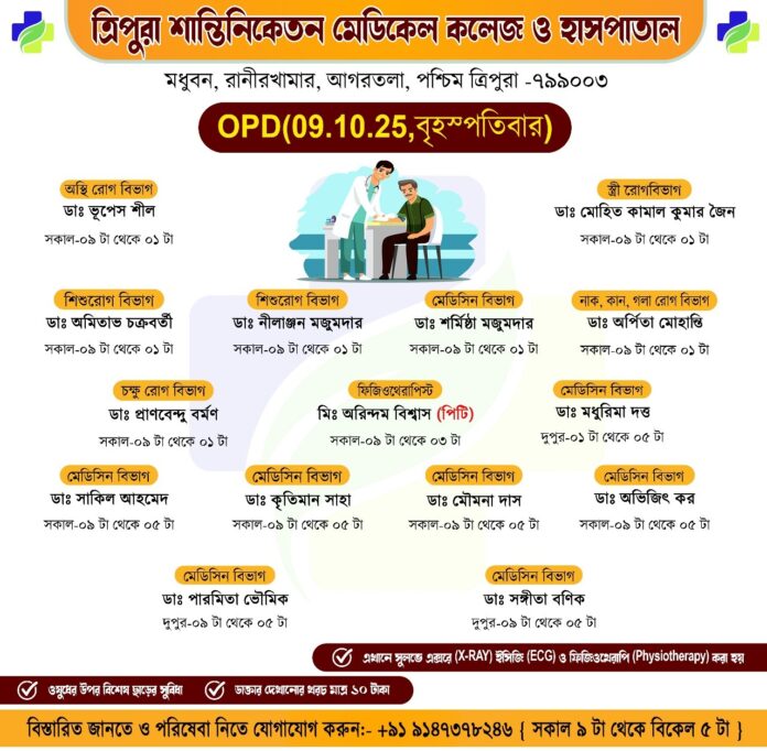 সাধারণ মানুষকে সুলভে সুচিকিৎসা পৌঁছে দিতে প্রতিশ্রুতিবদ্ধ ত্রিপুরা শান্তিনিকেতন মেডিকেল কলেজ ও হাসপাতাল। আগামীকালের ১০টাকার পরিষেবা নিম্নরুপ :