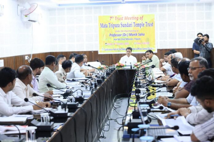 গোমতী জেলার জেলাশাসকের কনফারেন্স হলে মাতা ত্রিপুরাসুন্দরী মন্দির ট্রাস্টের সপ্তম বৈঠক আজ অনুষ্ঠিত হয়। বৈঠকে সভাপতিত্ব করেন ট্রাস্টের চেয়ারম্যান তথা মুখ্যমন্ত্রী প্রফেসর (ডা.) মানিক সাহা। মাতাবাড়ি মন্দির প্রাঙ্গনের উন্নয়ন, সংস্কার এবং রক্ষনাবেক্ষণ সংক্রান্ত বিভিন্ন বিষয় নিয়ে বৈঠকে বিস্তারিত আলোচনা হয়। মুখ্যমন্ত্রী মন্দির এলাকার সামগ্রিক উন্নয়নের জন্য প্রয়োজনীয় পদক্ষেপ গ্রহণের ওপর গুরুত্ব আরোপ করেন। এছাড়া, আসন্ন দীপাবলি মেলাকে সফল ও সুষ্ঠুভাবে সম্পন্ন করার লক্ষ্যে বিভিন্ন প্রস্তুতি এবং সমন্বয়মূলক কার্যক্রম নিয়েও আলোচনা অনুষ্ঠিত হয়। বৈঠকে উপস্থিত ছিলেন অর্থমন্ত্রী প্রণজিৎ সিংহ রায়, গোমতী জেলা পরিষদের সভাধিপতি দেবল দেবরায়, বিধায়ক অভিষেক দেবরায়, বিধায়ক জিতেন্দ্র মজুমদার, উদয়পুর পুর পরিষদের চেয়ারপার্সন শীতল চন্দ্র মজুমদার, মুখ্যসচিব জে. কে. সিনহা, রাজস্ব সচিব বিজেশ পান্ডে, পর্যটন দপ্তরের সচিব উত্তম কুমার চাকমা, অতিরিক্ত জেলা শাসক জয়ন্ত চক্রবর্তী সহ অন্যান্য কর্মকর্তাগণ।