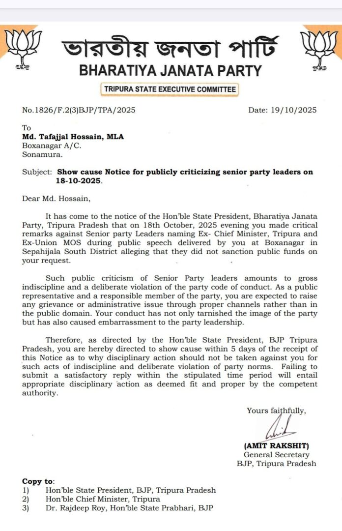 বক্সনগর বিধানসভা কেন্দ্রের বিধায়ক তফাজ্জল হোসেন ত্রিপুরা বিজেপির অভ্যন্তরে রাজনৈতিক চাপানোত্তর সৃষ্টি করেছেন। রাজ্য বিজেপির তরফে আজ এক চিঠিতে শোকজ করা হল তাকে। তাঁর বিরুদ্ধে অভিযোগ গত ১৮ অক্টোবর এক জনসভায় প্রকাশ্যে দলের নেতৃত্বের বিরুদ্ধে সমালোচনামূলক মন্তব্য করেছেন। ওই দিন বক্সনগরে দেওয়া বক্তৃতায় তিনি প্রাক্তন মুখ্যমন্ত্রী বিপ্লব কুমার দেব ও প্রাক্তন কেন্দ্রীয় প্রতিমন্ত্রী প্রতিমা ভৌমিকের বিরুদ্ধে অভিযোগ তোলেন, তাঁরা জনস্বার্থে প্রয়োজনীয় তহবিল মঞ্জুর করেননি।দলীয় শৃঙ্খলা ভঙ্গের অভিযোগে বিজেপি রাজ্য কমিটির সাধারণ সম্পাদক অমিত রক্ষিত স্বাক্ষরিত এই নোটিশে বলা হয়েছে, একজন জননেতা হিসেবে এ ধরনের মন্তব্য “গুরুতর শৃঙ্খলাভঙ্গ ও দলের আচরণবিধির লঙ্ঘন। প্রদেশ বিজেপি সভাপতির নির্দেশে তফাজ্জল হোসেনকে পাঁচ দিনের মধ্যে কারণ দর্শানোর নির্দেশ দেওয়া হয়েছে। কেন তাঁর বিরুদ্ধে দলীয় শৃঙ্খলাভঙ্গের অভিযোগে ব্যবস্থা নেওয়া হবে না। এই সময়ের মধ্যে সন্তোষজনক জবাব না পেলে উপযুক্ত শাস্তিমূলক ব্যবস্থা নেওয়া হবে বলেও চিঠিতে উল্লেখ করা হয়েছে।