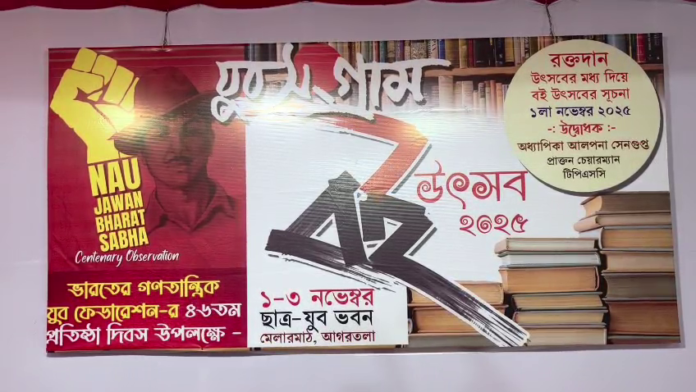 আগামী ৩ নভেম্বর ভারতের গণতান্ত্রিক যুব ফেডারেশন তথা ডি ওয়াই এফ আই এর ৪৬ তম প্রতিষ্ঠা দিবস। এই ডিআইএফআই হচ্ছে স্বাধীনতা আন্দোলনের সময় ভগৎ সিং এর নেতৃত্বে গঠিত নজওয়ান ভারত সভার উত্তরাধিকার ।এ বছর নজওয়ান ভারত সভার ১০০ বছর পূর্ণ হচ্ছে ।নজওয়ান ভারত সভার ১০০ বছর পূর্তি এবং ডি ওয়াই এফ আই’র ৪৬ বছর পূর্তি উদযাপন উপলক্ষে তিন দিনের বই উৎসবের আয়োজন করেছে ডিওয়াইএফআই’র ত্রিপুরা রাজ্য শাখা ।রাজধানীর মেলার মাঠস্হিত ছাত্র-যুব ভবন প্রাঙ্গণে এই বই উৎসবের আয়োজন করা হয়েছে ।এদিন এর উদ্বোধন করেন অধ্যাপিকা আলপনা সেনগুপ্তা ।তিনদিনের বই উৎসবকে কেন্দ্র করে সাংস্কৃতিক অনুষ্ঠান ,কুইজ প্রতিযোগিতা ,আর্ট প্রতিযোগিতা প্রভৃতি অনুষ্ঠানের আয়োজন করা হয়েছে ।এদিন এই বই উৎসবের সূচনা অনুষ্ঠান এর অঙ্গ হিসেবে ছাত্র যুব ভবনে ডিওয়াইএফআইয়ের জিরানিয়া বিভাগীয় কমিটির উদযোগে এক রক্তদান শিবিরের আয়োজন করা হয়। ডি ওয়াই এফ আই রাজ্য সম্পাদক নবারুন দেব এই সংবাদ জানিয়েছেন।