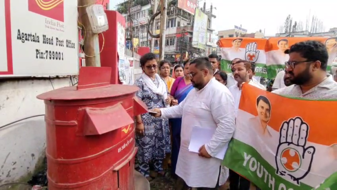 আগরতলা : ভারতের বর্তমান সরকার এবং ত্রিপুরা সরকার নেশা মুক্ত দেশ এবং রাজ্য গড়ার কথা বলছে, অথচ এই সরকার পরিচালিত ইন্ডিয়ান রেলে করে বিপুল পরিমাণ নেশা সামগ্রী ত্রিপুরা রাজ্যে প্রবেশ করছে। তার এক জ্বলন্ত উদাহরণ হল গত ১৫ অক্টোবর আগরতলার পার্শ্ববর্তী জিরানিয়া রেলওয়ে স্টেশনে মালবাহী ট্রেনের দুটি বগি থেকে বিপুল পরিমাণ নেশা সামগ্রী উদ্ধার হয়। এই পাচার বাণিজ্যের সঙ্গে জড়িত রয়েছে শাসক দলের একাংশ নেতা কর্মী। এই অভিযোগ ত্রিপুরা প্রদেশ কংগ্রেসের। এই অভিযোগ কে সামনে রেখে রবিবার রাজধানী আগরতলায় ত্রিপুরা প্রদেশ যুবক কংগ্রেস এবং ত্রিপুরা প্রদেশ মহিলা কংগ্রেসের নেতৃত্বে এক বিক্ষোভ কর্মসূচির আয়োজন করা হয়। পাশাপাশি কেন্দ্রীয় রেলমন্ত্রী অশ্বিনী বৈষ্ণবের কাছে চিঠি পাঠিয়ে জানতে চাওয়া হয় কিভাবে সরকারি ট্রেনে করে নেশা সামগ্রী ত্রিপুরা রাজ্যে এসে পৌঁছাচ্ছে। নেশা কারবারের সঙ্গে যুক্তদের তদন্ত করে ধরে দৃষ্টান্তমূলক শাস্তির দাবি জানানো হয়। এদিন প্রদেশ যুব কংগ্রেসের সভাপতি নীলকমল সাহা এবং প্রদেশ মহিলা কংগ্রেসের সবার নেত্রী সর্বানির ঘোষ চক্রবর্তীর নেতৃত্বে নেতাকর্মীরা রাজধানী আগরতলার পোস্ট অফিসের সামনের এসে দাঁড়িয়ে বিক্ষোভ দেখান এবং কেন্দ্রীয় রেল দপ্তরের মন্ত্রী অশ্বিনী বৈষ্ণবের উদ্দেশ্যে চিঠি প্রেরণ করেন।