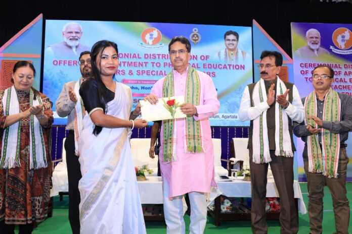 রাজ্যে শিক্ষা ও স্বাস্থ্য ব্যবস্থার উন্নয়নে কোনও ধরনের আপোষ করা হচ্ছে না। এসবক্ষেত্রে যাতে যোগ্য মানবসম্পদের অভাব না হয় তারজন্য সরকার প্রতিশ্রুতিবদ্ধ । ডাই-ইন-হারনেস সহ রাজ্যে আজ পর্যন্ত ২০ হাজার ১৮১ জনকে বিভিন্ন দপ্তরে চাকরি দেওয়া হয়েছে। এরমধ্যে শিক্ষা দপ্তরেই ৬ হাজার ৯৯৮ জনকে পি.জি.টি, জি.টি. এবং ইউ.জি.টি. হিসেবে নিয়োগপত্র দেওয়া হয়েছে। কারণ বর্তমান সরকারের লক্ষ্য ছাত্রছাত্রীরা যাতে গুণগতমান সম্পন্ন শিক্ষা পায়, শিক্ষা প্রতিষ্ঠানগুলিতে ছাত্রছাত্রী বান্ধব শিক্ষার পরিবেশ গড়ে উঠে। আজ মুক্তধারা অডিটোরিয়ামে ফিজিক্যাল এডুকেশন টিচার এবং স্পেশাল এডুকেটরদের মধ্যে নিয়োগপত্র প্রদান অনুষ্ঠানের উদ্বোধন করে একথা বলেন মুখ্যমন্ত্রী প্রফেসর (ডা.) মানিক সাহা। উল্লেখ্য, বিদ্যালয় শিক্ষা দপ্তরের অধীনে ১০২ জনকে ফিজিক্যাল এডুকেশন টিচার এবং ৫৫ জন স্পেশাল এডুকেটরদের নিয়োগপত্র প্রদান করা হয়। প্রতীকী হিসেবে মুখ্যমন্ত্রী কয়েকজনের হাতে নিয়োগপত্র তুলে দেন।