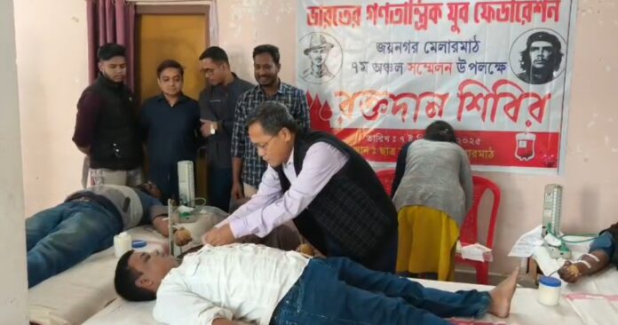 রবিবার ভারতের গণতান্ত্রিক যুব ফেডারেশনের জয়নগর অঞ্চল কমিটির সপ্তম সম্মেলন উপলক্ষে মেলারমাঠ স্থিত ছাত্র যুব ভবনে এক স্বেচ্ছায় রক্তদান শিবিরের আয়োজন করা হয়। এদিনের কর্মসূচিতে উপস্থিত ছিলেন রাজ্যের বিরোধী দলনেতা তথা সিপিআইএম পুলিটব্যুরোর সদস্য জিতেন্দ্র চৌধুরী। এদিন বিরোধী দলনেতা জিতেন্দ্র চৌধুরী সংবাদ মাধ্যমকে জানান বর্তমান যুবসমাজের মধ্যে আত্মকেন্দ্রিক চিন্তাধারা সক্রিয় হয়ে উঠেছে, এই সময় ডিওয়াইএফআই তাদের সম্মেলন উপলক্ষে আয়োজিত রক্তদান শিবিরের মধ্য দিয়ে এই চিন্তাধারা থেকে যুব সমাজ যেন বেরিয়ে আসতে পারে সেই লক্ষ্যে তাদের প্রয়াস অব্যাহত রয়েছে এবং সমাজের জন্য কোন কিছু করা এই চিন্তাধারা যেন প্রত্যেক যুব সমাজের মধ্যে জাগ্রত করা যায় সেই উপলক্ষে তাদের প্রয়াস অব্যাহত রয়েছে বলে জানান। তার পাশাপাশি ডি ওয়াই এফ আই এর সম্মেলন উপলক্ষে তারা যে রক্তদান শিবিরের আয়োজন করেছে তার ভুয়সি প্রশংসা করেন তিনি। এদিনের রক্তদান শিবিরকে কেন্দ্র করে উপস্থিত রক্তদাতাদের মধ্যে উৎসাহ ছিল লক্ষণীয়।