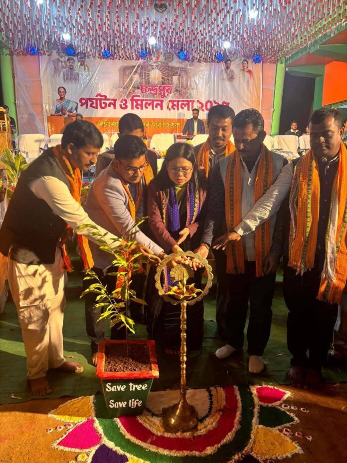 ত্রিপুরায় পর্যটনের ক্ষেত্রে অপার সম্ভাবনা রয়েছে। মানুষের আর্থসামাজিক উন্নয়নে পর্যটন শিল্পের গুরুত্বপূর্ণ ভূমিকা রয়েছে। তথ্য ও সংস্কৃতি দপ্তর এবং রাজনগর ব্লকের যৌথ উদ্যোগে আজ বিলোনিয়া মহকুমার রাজনগর ব্লকের চন্দ্রপুরে তিনদিন ব্যপী পর্যটন ও মিলন মেলার উদ্বোধন করে একথা বলেন শিল্প ও বাণিজ্য মন্ত্রী সান্তনা চাকমা। তিনি বলেন, বিভিন্ন মেলায় জাতি, ধর্ম, বর্ণ নির্বিশেষে সকল অংশের মানুষের আগমনের ফলে সকলের মধ্যে একতা তৈরী হয়। শিল্পমন্ত্রী আরও বলেন, প্রধানমন্ত্রী নরেন্দ্র মোদি পর্যটন শিল্পের উন্নয়নের পাশাপাশি দেশীয় পণ্যের ব্যবহার বাড়ানোর উপর বিশেষ গুরুত্ব আরোপ করেছেন। এলক্ষ্যে বর্তমান সরকারের সময়ে রাজ্যে স্বসহায়ক দলের সংখ্যা উল্লেখযোগ্য হারে বেড়েছে। তাই তিনি সকলকে দেশীয় পণ্য ব্যবহারের আহ্বান জানান। অনুষ্ঠানে দক্ষিণ ত্রিপুরা জিলা পরিষদের সভাধিপতি দীপক দত্ত বলেন, এই ধরণের অনুষ্ঠানের মাধ্যমে সকল অংশের মানুষের মধ্যে ভ্রাতৃত্ববন্ধন সুদৃঢ় হয়। অনুষ্ঠানে এছাড়াও বক্তব্য রাখেন জেলাশাসক মোঃ সাজাদ পি, সমাজসেবী দীপায়ন চৌধুরী, সমাজসেবী চন্দন দেবনাথ প্রমুখ। অনুষ্ঠানে এছাড়াও উপস্থিত ছিলেন, ঋষ্যমুখ পঞ্চায়েত সমিতির চেয়ারম্যান শম্ভুনাথ কর, রাজনগর পঞ্চায়েত সমিতির ভাইস চেয়ারম্যান জয়দেব সরকার, বিলোনিয়া মহকুমার মহকুমা শাসক দেবাশিস দাস প্রমুখ। স্বাগত বক্তব্য রাখেন রাজনগর ব্লকের বিডিও বিদ্যাসাগর ত্রিপুরা। অনুষ্ঠানে সভাপতিত্ব করেন রাজনগর পঞ্চায়েত সমিতির চেয়ারম্যান বিশ্বজিৎ নাথ। উদ্বোধনী অনুষ্ঠান শেষে সাংস্কৃতিক মঞ্চে সারারাত ব্যপী দক্ষিণ ত্রিপুরা জেলার শিল্পীদের দ্বারা পরিবেশিত হয় মনোজ্ঞ সাংস্কৃতিক অনুষ্ঠান। এছাড়াও অতিথিগণ সরকারি প্রদর্শনী স্টলের উদ্বোধন করেন। অনুষ্ঠানে মুখ্যমন্ত্রী চা শ্রমিক কল্যাণ প্রকল্পে ২৫ জনের হাতে পাট্টার দলিল তুলে দেওয়া হয়।
