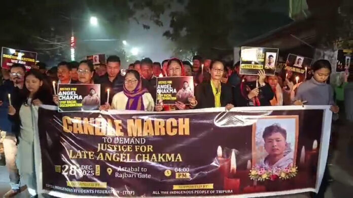 অল দ্যা ইন্ডিজেনিয়ার্স পিপলস অফ ত্রিপুরা সহযোগিতায় ত্রিপুরা ইন্ডিজেনিয়ার্স স্টুডেন্ট ফেডারেশন (TISF) এর উদ্যোগে মোমবাতি মিছিল অনুষ্ঠিত হয় । মূলত গত কয়েকদিন আগে দেরাদুনে এঞ্জেল চাকমা নামে এক স্টুডেন্টকে বিভিন্নভাবে হ্যারেসমেন্ট করে মারা হয় এবং পরবর্তী সমস্যা সে মৃত্যুর কোলে ঢলে পড়েন , তার এই প্রতিবাদ জানিয়ে আজ ত্রিপুরা ইন্ডিজেনিয়ার্স স্টুডেন্ট ফেডারেশন এই মোমবাতি মিছিল সংঘটিত হয় এদিন এই মোমবাতি মিছিলের উপস্থিত ছিলেন ইউথ তিপ্রা ফেডারেশন সভাপতি সুরজ দেববর্মা সহ এডিসি CEM পূর্ণ চন্দ্র জমাতিয়া সহ অন্যান্যরা । ঐদিন আগরতলা আস্তাবল ময়দানের সামনে থেকে রেলি শুরু করে শহরের বিভিন্ন পথ ঘুরে উজ্জয়ন্ত প্যালেসের সামনে গিয়ে রেলিটি শেষ হয় ।