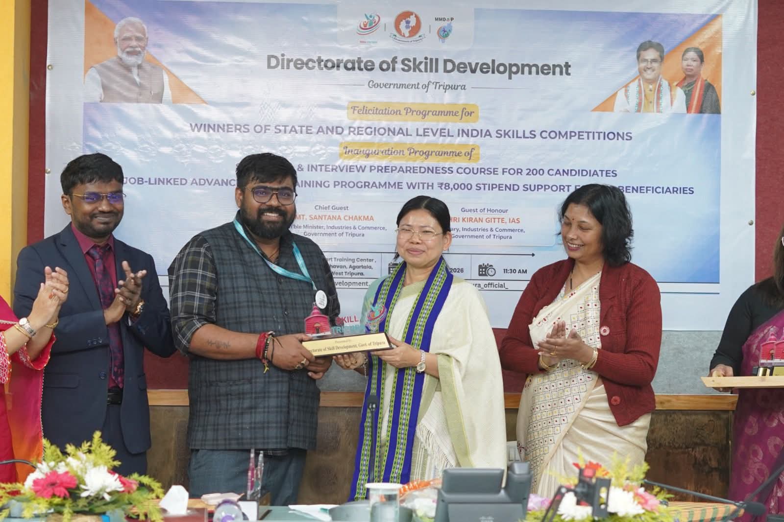 রাজ্য সরকার মুখ্যমন্ত্রী দক্ষতা উন্নয়ন প্রকল্পে বিভিন্ন ট্রেডে প্রশিক্ষণ দিয়ে বেকার যুবক যুবতীদের স্বাবলম্বী করার প্রয়াস নিয়েছে। তবে এজন্য চাই সততা, নিষ্ঠা ও কঠোর শ্রম। তবেই সফলতা আসবে। রাজ্য সরকার জাতি, ধর্ম, বর্ণ নির্বিশেষে সকলকে নিয়ে এক ত্রিপুরা, শ্রেষ্ঠ ত্রিপুরা গড়ার লক্ষ্য নিয়ে কাজ করছে। শিল্প ও বাণিজ্য মন্ত্রী সান্ত্বনা চাকমা আজ তথ্য প্রযুক্তি দপ্তরের স্মার্ট ট্রেনিং সেন্টারে আয়োজিত রাজ্য ও আঞ্চলিক স্তরের স্কিল ইন্ডিয়া কমপিটিশনে (২০২৫-২৬) বিজয়ীদের পুরস্কার বিতরণী অনুষ্ঠানে একথা বলেন। অনুষ্ঠানে তিনি দক্ষতা অর্জনের জন্য ‘সফট স্কিলস এন্ড ইন্টারভিউ প্রিপেয়ার্ডনেস এবং অ্যাডভান্স জি ডি এ কোর্সেস ফর নার্সিং প্রফেশন্যালস’ এই দু’টি কোর্সের সূচনা করেন। এছাড়া তিনি সম্প্রতি আসাম রাজ্যে অনুষ্ঠিত রিজিওন্যাল ইন্ডিয়া স্কিলস কমপিটিশনে রাজ্যের ২ জন স্বর্ণ পদক, ২ জন রৌপ্য পদক, ১ জন ব্রোঞ্চ পদক এবং ১ জন মেডালিয়ন অফ অ্যাক্সিলেন্স পদক বিজয়ীকে পুরস্কৃত করেন। মুখ্যমন্ত্রী দক্ষতা উন্নয়ন প্রকল্পে তিনি বিজয়ীদের হাতে যথাক্রমে ৭৫ হাজার, ৫০ হাজার ও ২৫ হাজার টাকার চেক তুলে দেন।