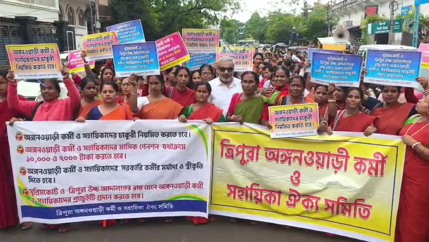 দীর্ঘদিনের দাবি-দাওয়া পূরণের দাবিতে আবারও আন্দোলনের পথে নামলেন ত্রিপুরা অঙ্গনওয়াড়ী কর্মী ও সহায়িকা ঐক্য সমিতির সদস্যরা। মঙ্গলবার রাজধানী আগরতলায় মিছিল সংগঠিত করে তারা সমাজ কল্যাণ ও সমাজ শিক্ষা দপ্তরের অধিকর্তার নিকট ডেপুটেশন প্রদান করেন।