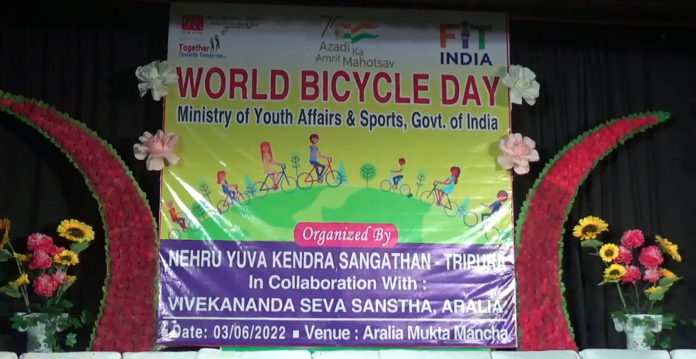 ভারত সরকারের ক্রীড়া ও যুব কল্যাণ মন্ত্রণালয়ের অন্তর্গত নেহেরু যুব কেন্দ্র ত্রিপুরার উদ্যোগে ও বিবেকানন্দ সেবা সংস্থার সহযোগিতায় আজ আজাদিকা অমৃত মহোৎসবের অংশ হিসেবে শুক্রবার আড়ালিয়া প্রিয়লাল সাহা স্মৃতি মিলনায়তনে বিশ্ব সাইকেল দিবস উদযাপন কর্মসূচি আনুষ্ঠানিক সূচনা হয়। এদিন মঙ্গলদীপ প্রজ্জ্বলনের মাধ্যমে এই অনুষ্ঠানের আনুষ্ঠানিক সূচনা করেন ত্রিপুরা রাজ্য ক্রীড়া ও যুব বিষয়ক দপ্তর এর অধিকর্তা সুবিকাশ দেব্বর্মা। অনুষ্ঠানে প্রধান অতিথি হিসেবে উপস্থিত ছিলেন রাজ্যের সোনার মেয়ে দীপা কর্মকার। এদিন দীপা কর্মকার বক্তব্য রাখতে গিয়ে বলেন বহু দেশে গিয়ে দেখেছেন সেখানকার মানুষ প্রায় সকলেই বাইসাইকেল ব্যবহার করে থাকেন যাতে করে সেখানকার পরিবেশ যেমন সুস্থ থাকে তেমনি দেহ মন ও ভালো থাকে তাই তিনি অনুরোধ রাখেন আমাদের দেশ এবং রাজ্যের সকলেই যেন বাইসাইকেল ব্যবহার করেন যার ফলে পরিবেশ সুরক্ষিত থাকবে। এদিনের অনুষ্ঠানে অন্যান্যদের মধ্যে উপস্থিত ছিলেন রাজ্যের অর্জুন পুরস্কার প্রাপক মন্টু দেবনাথ, এন এস এস স্টেট প্রোগ্রাম অফিসার ডক্টর চিত্রজিৎ ভৌমিক, ডিস্ট্রিক হেলথ অফিসার ডক্টর সঙ্গীতা চক্রবর্তী। এদিনের অনুষ্ঠানকে কেন্দ্র করে উপস্থিত প্রতিযোগিদের মধ্যে উৎসাহ উদ্দীপনা লক্ষ্য করা যায়।