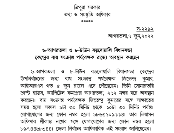 আসন্ন উপনির্বাচনে ৮ – টাউন বড়দোয়ালী নির্বাচন কেন্দ্রের জন্য নিযুক্ত নির্বাচনী অবজার্ভার গৌতম মজুমদার ( আই এ এস ) ৫ জুন , ২০২২ রাজ্যে এসে পৌঁছেছেন । তিনি আগরতলা সোনারতরী গেস্ট হাউসের রুম নং ২১৩ – এ অবস্থান করছেন । তাঁর ফোন নম্বর হচ্ছে ৮৮৩৭২৪৭৮৪৪ এবং দেখা করার সময় হচ্ছে বিকাল ৪ টা থেকে ৫ টা তাঁর সাথে দেখা করতে হলে সংযোগকারী আধিকারিক জীবন দেববর্মার সাথে যোগাযোগ করতে হবে ৮৪১৫৮ ১৭৩০৪ মোবাইল নম্বরে । পশ্চিম ত্রিপুরা জেলার জেলাশাসক তথা জেলা নির্বাচন আধিকারিক এই তথ্য জানিয়েছেন ।