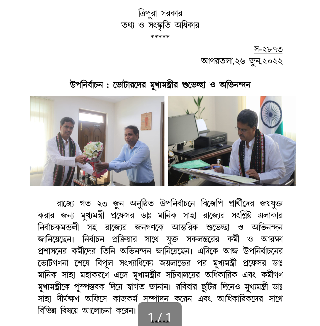রাজ্যে গত ২৩ জুন অনুষ্ঠিত উপনির্বাচনে বিজেপি প্রার্থীদের জয়যুক্ত করার জন্য মুখ্যমন্ত্রী প্রফেসর ডাঃ মানিক সাহা রাজ্যের সংশ্লিষ্ট এলাকার নির্বাচকমন্ডলী সহ রাজ্যের জনগণকে আন্তরিক শুভেচ্ছা ও অভিনন্দন জানিয়েছেন । নির্বাচন প্রক্রিয়ার সাথে যুক্ত সকলস্তরের কর্মী ও আরক্ষা প্রশাসনের কর্মীদের তিনি অভিনন্দন জানিয়েছেন । এদিকে আজ উপনির্বাচনের ভোটগণনা শেষে বিপুল সংখ্যাধিক্যে জয়লাভের পর মুখ্যমন্ত্রী প্রফেসর ডাঃ মানিক সাহা মহাকরণে এলে মুখ্যমন্ত্রীর সচিবালয়ের অধিকারিক এবং কর্মীগণ মুখ্যমন্ত্রীকে পুস্পস্তবক দিয়ে স্বাগত জানান । রবিবার ছুটির দিনেও মুখ্যমন্ত্রী ডাঃ সাহা দীর্ঘক্ষণ অফিসে কাজকর্ম সম্পাদন করেন এবং আধিকারিকদের সাথে বিভিন্ন বিষয়ে আলোচনা করেন । 1/1