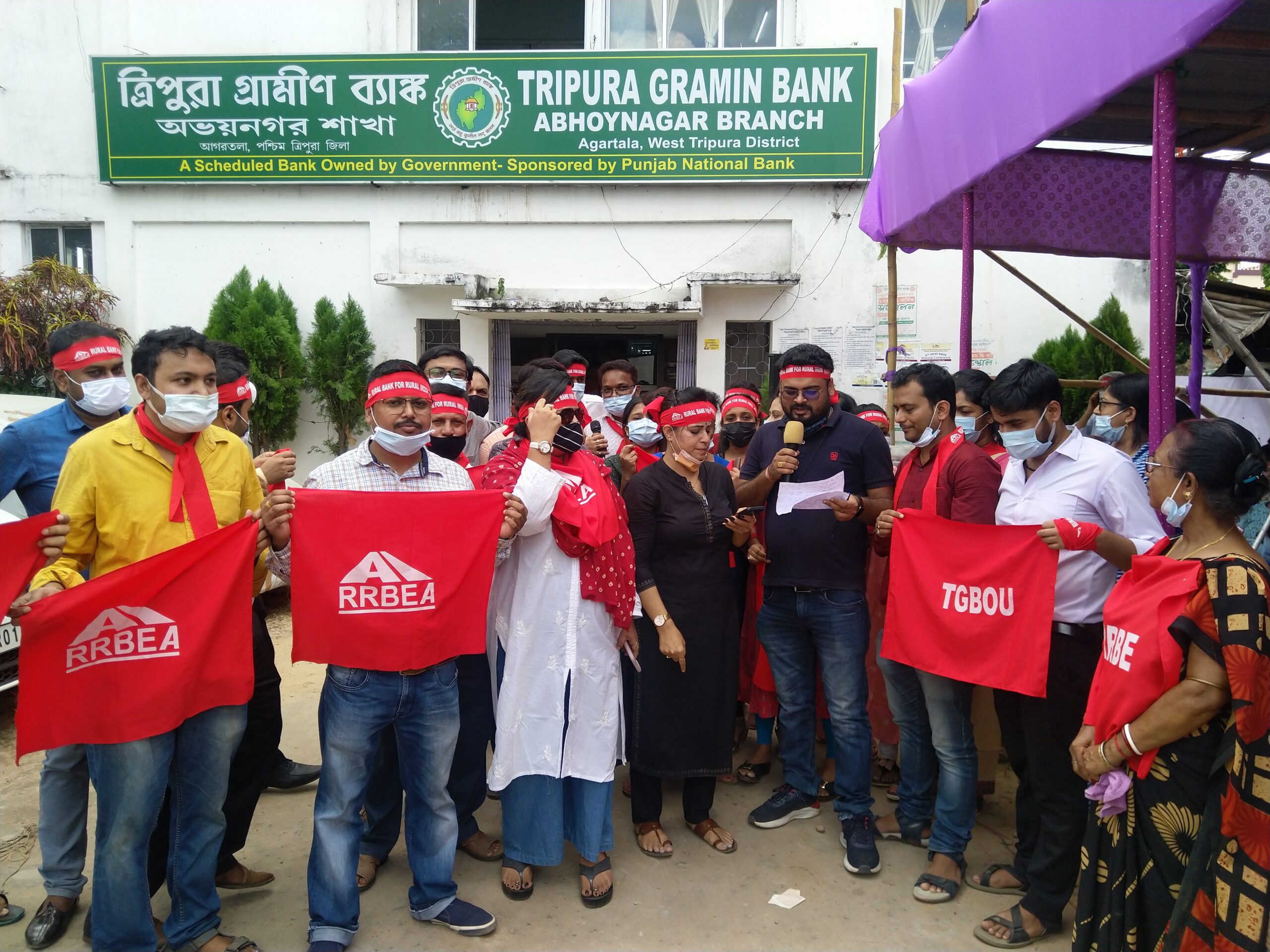 গ্রামীণ ব্যাংকের বৃহৎ সর্বভারতীয় সংগঠন অল ইন্ডিয়া রিজিওনাল রুরাল ব্যাংক এমপ্লয়ীজ অ্যাসোসিয়েশনের সারা ভারতব্যাপী ব্যাপক আন্দোলন কর্মসূচীর অঙ্গ হিসেবে ত্রিপুরা গ্রামীণ ব্যাংক কর্মচারী সমিতি, ত্রিপুরা গ্রামীণ ব্যাংক অফিসার্স ইউনিয়ন ও ত্রিপুরা গ্রামীণ ব্যাংক রিটায়ার্ড স্টাফ অ্যাসোসিয়েশনের যৌথ সংগ্রাম মঞ্চের ডাকে গ্রামীণ ব্যাংকগুলিকে বেসরকারিকরণের প্রতিবাদে ও অন্যান্য ১২ দফা দাবী আদায়ের লক্ষে আজ শুক্রবার ত্রিপুরা গ্রামীণ ব্যাংকের প্রধান কার্যালয়ের সামনে এক গনধর্না অনুষ্ঠিত হয়। এই গণধর্নায় ত্রিপুরা গ্রামীণ ব্যাংকের বিভিন্ন শাখা ইউনিট থেকে ২০৭ জন কর্মচারী ও অফিসার প্রতিনিধি অংশগ্রহণ করেন। ধর্না মঞ্চে বক্তব্য রাখেন ত্রিপুরা গ্রামীণ ব্যাংক অফিসার্স ইউনিয়নের সাধারন সম্পাদক সঞ্জয় দাস, ত্রিপুরা গ্রামীণ ব্যাংক কর্মচারী সমিতির সাধারন সম্পাদক রত্না ব্যানার্জী, সারা ভারত নেতৃত্ব সমীর দেববর্মা,ব্যাংক এমপ্লয়ীজ ফেডারেশন অফ ত্রিপুরার সম্পাদক জহর লাল দে।