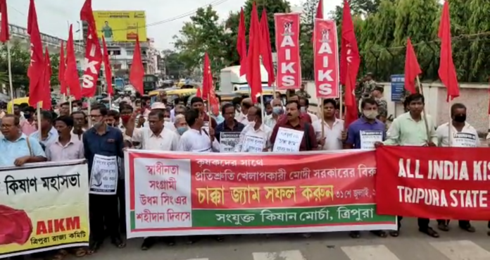 স্বাধীনতা সংগ্রামী উধম সিং এর শহীদান দিবসে,সংযুক্ত কিসান মোর্চা ত্রিপুরার ন্যুনতম সহায়ক মূল্যের আইন প্রনয়ন ,কৃষক আন্দোলনের সময় কৃষকদের ওপর করা মামলা প্রত্যাহার ,লখিমপুর খেরিতে কৃষক ও সাংবাদিক হত্যায় অভিযুক্তদের দৃষ্টান্ত মূ শাস্তি ওকেন্দ্রীয় মন্ত্রী অজয় মিশ্র টেনিকে মন্ত্রীসভা থেকে বরখাস্তের দাবিতে ৩১শে জুলাই রবিবার সকালে আগরতলার বিবেকানন্দ ময়দানে বিবেকানন্দ মূর্তির সামনে মোর্চার জমায়েত ও চাক্কা জ্যাম’ কর্মসূচিত করা হয়, এই দিন উপস্থিত ছিলেন সংযুক্ত কিষান মোর্চা এিপুরা আহবায়ক পবিত্র কর সহ অন্যান নেতৃত্বরা। এই দিন সংযুক্ত কৃষাণ মোর্চা ত্রিপুরা আহবায়ক পবিত্র কর বক্তব্য রাখতে গিয়ে বলেন ২০২১ সাল করুণা অতি মারির মধ্যেও দেশের কৃষকরা এক বছরের উপরে রাস্তায় বসেছিল পুলিশের নিপীড়ন অত্যাচার সমস্ত কিছুকে এবং নরেন্দ্র মোদি সরকারের অবজ্ঞা সমস্ত কিছুকে উপেক্ষা করে পাঁচ শতাধিক কৃষক সংগঠন তারা এই লড়াই চালিয়েছিলেন শেষ পর্যন্ত এই অহংকারী নরেন্দ্র মোদি সরকারকে মাথা নত করে কৃষকদের যে প্রধান দাবি কৃষিআইন বাতিল করা তা প্রত্যাহার করতে বাধ্য হয়েছিলেন বলে উনার বক্তব্যে তোলে ধরেন।