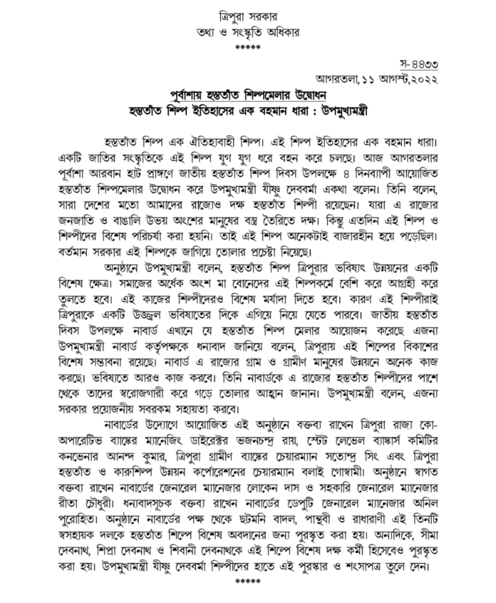 হস্ততাঁত শিল্প এক ঐতিহ্যবাহী শিল্প । এই শিল্প ইতিহাসের এক বহমান ধারা । একটি জাতির সংস্কৃতিকে এই শিল্প যুগ যুগ ধরে বহন করে চলছে । আজ আগরতলার পূর্বাশা আরবান হাট প্রাঙ্গণে জাতীয় হস্ততাঁত শিল্প দিবস উপলক্ষে ৪ দিনব্যাপী আয়োজিত হস্ততাঁত শিল্পমেলার উদ্বোধন করে উপমুখ্যমন্ত্রী যীষ্ণু দেববর্মা একথা বলেন । তিনি বলেন , সারা দেশের মতো আমাদের রাজ্যেও দক্ষ হস্ততাঁত শিল্পী রয়েছেন । যারা এ রাজ্যের জনজাতি ও বাঙালি উভয় অংশের মানুষের বস্ত্র তৈরিতে দক্ষ । কিন্তু এতদিন এই শিল্প ও শিল্পীদের বিশেষ পরিচর্যা করা হয়নি । তাই এই শিল্প অনেকটাই বাজারহীন হয়ে পড়েছিল । বর্তমান সরকার এই শিল্পকে জাগিয়ে তোলার প্রচেষ্টা নিয়েছে । অনুষ্ঠানে উপমুখ্যমন্ত্রী বলেন , হস্ততাঁত শিল্প ত্রিপুরার ভবিষ্যৎ উন্নয়নের একটি বিশেষ ক্ষেত্র । সমাজের অর্ধেক অংশ মা বোনেদের এই শিল্পকর্মে বেশি করে আগ্রহী করে তুলতে হবে । এই কাজের শিল্পীদেরও বিশেষ মর্যাদা দিতে হবে । কারণ এই শিল্পীরাই ত্রিপুরাকে একটি উজ্জ্বল ভবিষ্যতের দিকে এগিয়ে নিয়ে যেতে পারবে । জাতীয় হস্ততাঁত দিবস উপলক্ষে নাবার্ড এখানে যে হস্ততাঁত শিল্প মেলার আয়োজন করেছে এজন্য উপমুখ্যমন্ত্রী নাবার্ড কর্তৃপক্ষকে ধন্যবাদ জানিয়ে বলেন , ত্রিপুরায় এই শিল্পের বিকাশের বিশেষ সম্ভাবনা রয়েছে । নাবার্ড এ রাজ্যের গ্রাম ও গ্রামীণ মানুষের উন্নয়নে অনেক কাজ করছে । ভবিষ্যতে আরও কাজ করবে । তিনি নাবার্ডকে এ রাজ্যের হস্ততাঁত শিল্পীদের পাশে থেকে তাদের স্বরোজগারী করে গড়ে তোলার আহ্বান জানান । উপমুখ্যমন্ত্রী বলেন , এজন্য সরকার প্রয়োজনীয় সবরকম সহায়তা করবে । নাবার্ডের উদ্যোগে আয়োজিত এই অনুষ্ঠানে বক্তব্য রাখেন ত্রিপুরা রাজ্য কো অপারেটিভ ব্যাঙ্কের ম্যানেজিং ডাইরেক্টর ভজনচন্দ্র রায় , স্টেট লেভেল ব্যাঙ্কার্স কমিটির কনভেনার আনন্দ কুমার , ত্রিপুরা গ্রামীণ ব্যাঙ্কের চেয়ারম্যান সত্যেন্দ্র সিং এবং ত্রিপুরা হস্ততাঁত ও কারুশিল্প উন্নয়ন কর্পোরেশনের চেয়ারম্যান বলাই গোস্বামী । অনুষ্ঠানে স্বাগত বক্তব্য রাখেন নাবার্ডের জেনারেল ম্যানেজার লোকেন দাস ও সহকারি জেনারেল ম্যানেজার রীতা চৌধুরী । ধন্যবাদসূচক বক্তব্য রাখেন নাবার্ডের ডেপুটি জেনারেল ম্যানেজার অনিল পুরোহিত । অনুষ্ঠানে নাবার্ডের পক্ষ থেকে ছটমনি বাদল , পান্থবী ও রাধারাণী এই তিনটি স্বসহায়ক দলকে হস্ততাঁত শিল্পে বিশেষ অবদানের জন্য পুরস্কৃত করা হয় । অন্যদিকে , সীমা দেবনাথ , শিপ্রা দেবনাথ ও শিবানী দেবনাথকে এই শিল্পে বিশেষ দক্ষ কর্মী হিসেবেও পুরস্কৃত করা হয় । উপমুখ্যমন্ত্রী যীষ্ণু দেববর্মা শিল্পীদের হাতে এই পুরস্কার ও শংসাপত্র তুলে দেন ।