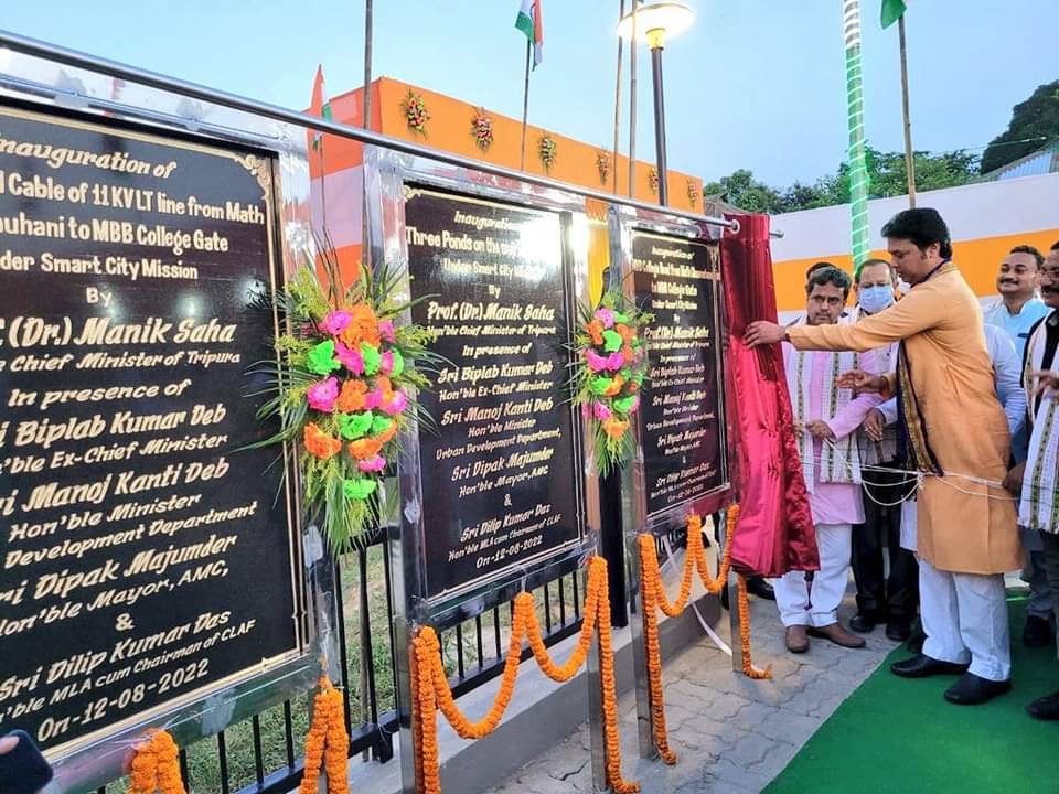 আজ নগর সৌন্দর্যায়ন ও পরিষেবা উন্নয়নের অংশ হিসেবে মঠ চৌমুহনি থেকে এমবিবি কলেজ পর্যন্ত স্মার্ট রোড, প্রথমবারের মত ভুগর্ভস্থ বিদ্যুৎ পরিবাহী সংযোগ ও লেক সৌন্দর্যায়ন প্রকল্পের উদ্বোধনী অনুষ্ঠান অনুষ্ঠিত হয়। এদিনের উদ্বোধনী অনুষ্ঠানে উপস্থিত ছিলেন রাজ্যের মুখ্যমন্ত্রী ডাঃ মানিক সাহা, রাজ্যের সদ্য প্রাক্তন মুখ্যমন্ত্রী তথা ৯ বনমালীপুর কেন্দ্রের বিধায়ক বিপ্লব কুমার দেব, বিধায়ক তথা রাজ্যের বিশিষ্ট চিকিৎসক ডাঃ দীলিপ দাস, মিশন ডিরেক্টর এবং আগরতলা স্মার্ট সিটি প্রকল্পের চিফ এক্সিকিউটিভ অফিসার শৈলেশ কুমার যাদবসহ ৯ বনমালীপুর কেন্দ্রের কর্পোরেটররা। এদিন মুখ্যমন্ত্রী ও সদ্য প্রাক্তন মুখ্যমন্ত্রীর হাত ধরে আনুষ্ঠানিক উদ্বোধন হয় নব নির্মিত মঠ চৌমুহনি থেকে এমবিবি কলেজ পর্যন্ত স্মার্ট রোড, প্রথমবারের মত ভুগর্ভস্থ বিদ্যুৎ পরিবাহী সংযোগ ও লেক সৌন্দর্যায়ন প্রকল্পের। এদিন বক্তব্য রাখতে গিয়ে এলাকার বিধায়ক তথা রাজ্যের সদ্য প্রাক্তন মুখ্যমন্ত্রী বিপ্লব কুমার দেব বলেন, ত্রিপুরার সর্বাঙ্গীন বিকাশে আদরণীয় প্রধানমন্ত্রী নরেন্দ্র মোদীজির আন্তরিক দৃষ্টির ফলশ্রুতিতে প্যারামিটারগত আংশিক সরলিকরণের দ্বারা স্মার্ট সিটির সফল রূপান্তর বাস্তবায়িত হচ্ছে l অবকাঠামো উন্নয়ন ও নাগরিক স্বাচ্ছন্দকে অগ্রাধিকারের ভিত্তিতে বনমালীপুর বিধানসভা কেন্দ্রের অন্তর্গত প্রায় ৬৬৭ কোটি টাকার প্রকল্প রূপায়ণ প্রক্রিয়া চলছে l জনতা পরিষেবার পিছু ছুটার বদলে, জনতার কাছে সমস্ত পরিষেবার সুফল পৌঁছে দেওয়াই আমাদের অন্যতম সংকল্প l এদিনের অনুষ্ঠানে দলীয় কর্মী সমর্থক এবং এলাকার মানুষের স্বতঃস্ফূর্ত উপস্থিতি ছিল লক্ষণীয়।