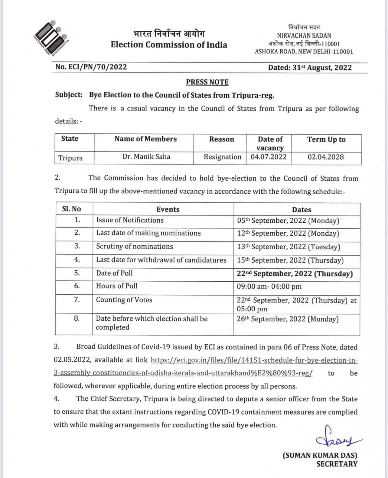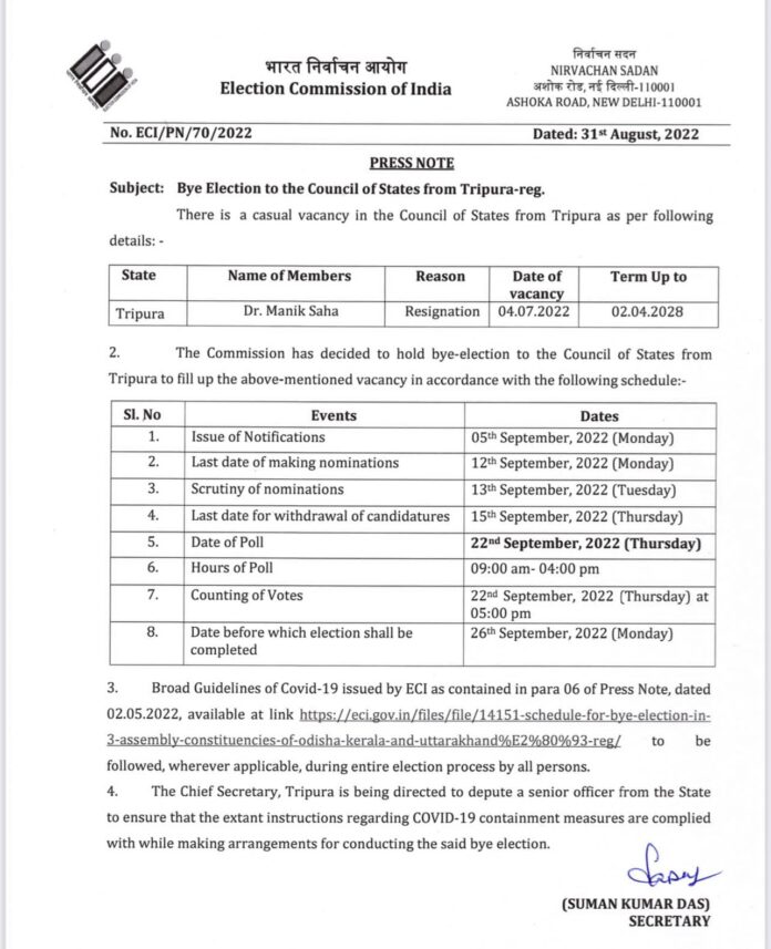 রাজ্যের একমাত্র রাজ্যসভার আসনে ফের নির্বাচনের দিনক্ষণ ঘোষণা করলো ভারতের নির্বাচন কমিশন। ডাক্তার মানিক সাহা সাংসদ পথ থেকে পদত্যাগ করায় এই আসনটি শূন্য হয়ে পড়ে। ত্রিপুরা প্রদেশ বিজেপির সভাপতি থাকাকালীন প্রায় তিন_চার মাস আগে রাজ্যের একমাত্র রাজ্যসভার আসন থেকে নির্বাচিত হয়েছিলেন ডাক্তার মানিক সাহা। এরপর তিনি মুখ্যমন্ত্রী হন। তাই সাংসদ পথ থেকে পদত্যাগ করা জরুরি হয় পড়েছিল। অবশেষে বিধায়ক নির্বাচিত হওয়ার পর তিনি সাংসদ পথ থেকে পদত্যাগ করেন। স্বাভাবিকভাবে এই আসনটি শূন্য হয়ে পড়ে। অবশেষে বুধবার রাজ্যের একমাত্র রাজ্যসভার শুন্য আসনে উপনির্বাচনের বিজ্ঞপ্তি জারি করে ভারতের নির্বাচন কমিশন। ৫ সেপ্টেম্বর বিজ্ঞপ্তি জারি হবে। ১২ তারিখ মনোনয়নপত্র জমা দেওয়ার শেষদিন। 13 সেপ্টেম্বর হবে মনোনয়নপত্র পরীক্ষা। ১৫ সেপ্টেম্বর প্রত্যাহারের শেষ দিন। আর ভোট নেওয়া হবে ২২ সেপ্টেম্বর সকাল ৯ টা থেকে বিকেল চারটা পর্যন্ত। এদিনই হবে ভোট গণনা।