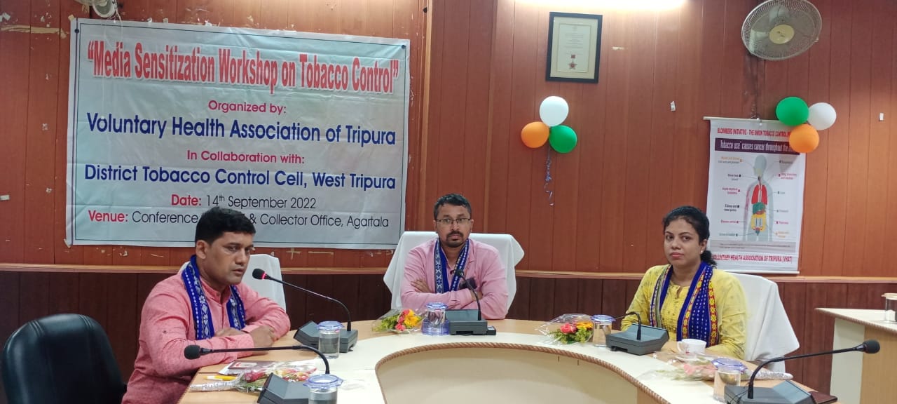 বুধবার ত্রিপুরার স্বেচ্ছাসেবী স্বাস্থ্য সংস্থার উদ্যোগে পশ্চিম ত্রিপুরা জেলা তামাক নিয়ন্ত্রণ সেলের সহযোগিতায় জেলাশাসকের কার্যালয়ের কনফারেন্স হলে তামাক নিয়ন্ত্রণের ওপর মিডিয়া সংবেদনশীল কর্মশালার আয়োজন করা হয়। এ দিনের কর্মশালা উপস্থিত ছিলেন জেলাশাসক দেবপ্রিয় বর্ধন, ড. ঈশিতা গুহ জেলা প্রোগ্রাম অফিসার, এনটিসিপি, শ্রী সুজিত ঘোষ, প্রকল্প ব্যবস্থাপক বিআই তামাক নিয়ন্ত্রণ প্রকল্প, ড. ভাস্কর রায় বিশ্বাস, ডিএনও, এনপিসিডিএস, পশ্চিম ত্রিপুরা, শ্রী অম্লান দেব জেলা পরামর্শক, এনটিসিপি অংশগ্রহণকারী এবং সম্পদ ব্যক্তি শ্রী প্রিয়তোষ পাল জেলা সমন্বয়কারী, ভিএইচএটি। এদিনের অনুষ্ঠানে উপস্থিত অতিথিরা তামাক সেবন এবং ধূমপানে মানব দেহে কি কি ক্ষতি হতে পারে ও ক্ষতির কারণ ভিডিও ভিজুয়ালাইজেশনের মাধ্যমে সংবাদ মাধ্যমের সামনে তুলে ধরেন। তাছাড়া এদিন জেলাশাসক দেবপ্রিয় বর্ধন এদিনের কর্মশালা মূল লক্ষ্য নিয়ে বলতে গিয়ে জানান তামাক কন্ট্রোল নিয়ে কি কি পদক্ষেপ প্রশাসন গ্রহণ করেছে এবং যারা তামাক ছাড়তে চায় তাদের জন্য কি কি সুবিধা রয়েছে সেগুলি সংবাদ মাধ্যমের সামনে উপস্থাপন করা। তাছাড়া এদিন তিনি আরো বলেন যে পশ্চিম ত্রিপুরা জেলার ১৫০ টি বিদ্যালয় কে তামাকমুক্ত বিদ্যালয় হিসেবে ঘোষণা করা হয়েছে বলে তাছাড়া আগামী দিনে সরকারি বিদ্যালয়ের পাশাপাশি বিভিন্ন সরকারি দপ্তর গুলোকে তাবাকুমুক্ত করার লক্ষ্যে দপ্তর কাজ করে চলছে বলে।