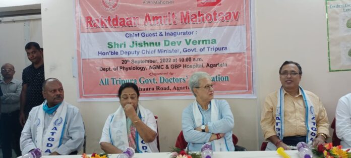 মঙ্গলবার অল ত্রিপুরা ডক্টর এসোসিয়েশনের উদ্যোগে আয়োজিত আয়োজিত হয় স্বেচ্ছায় রক্তদান শিবির। এদিনের রক্তদান শিবিরের উদ্বোধন করে উপমুখ্যমন্ত্রী যীষ্ণু দেববর্মা। এদিনের অনুষ্ঠানে উপ মুখ্যমন্ত্রী জিষ্ণু দেববর্মা বক্তব্য রাখতে গিয়ে কেইসে হো গা নেহিহে, সোচো কিউ নেহি হো গা ”প্রধানমন্ত্রী নরেন্দ্র মোদির এই উক্তির উদ্ধৃতি দিয়ে রাজ্যের উপমুখ্যমন্ত্রী জিষ্ণু দেব বর্মন বলেন , দ্রুত রাজ্যের উন্নয়নকে ত্বরান্বিত করতে হবে। রাজ্যের উন্নয়ন মানেই সমাজের উন্নয়ন। উন্নয়ন কাজে কারো সঙ্গে আপস করা চলবে না। প্রধানমন্ত্রী নরেন্দ্র মোদী চাইছে দেশের উন্নয়ন , একই সঙ্গে প্রধানমন্ত্রীর গুরুত্বারোপ করেছে উত্তর-পূর্বাঞ্চলের উপর। তাছাড়া তিনি আরও বলেন , রাজ্য সরকার তার নির্বাচনী প্রতিশ্রুতি মত সমস্ত কাজ দ্রুত রুপায়ন করে চলছে। এদিনের অনুষ্ঠানে অন্যান্যদের মধ্যে উপস্থিত ছিলেন এসোসিয়েশনের বিশিষ্ট ডাক্তারগন।
