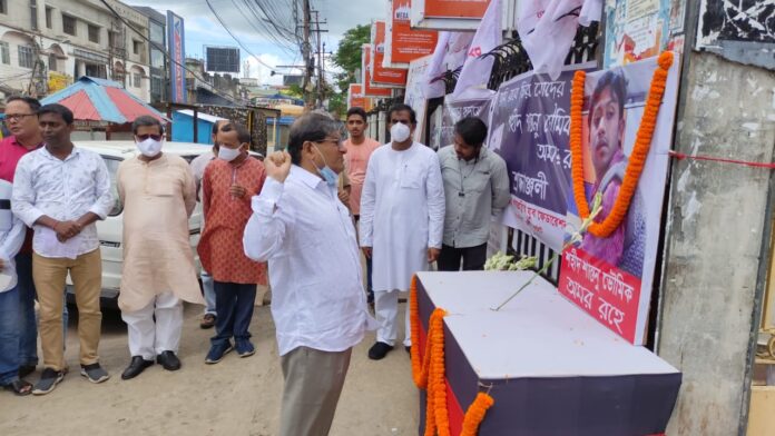 যথাযথ মর্যাদায় রাজ্যের শহীদ সাংবাদিক শান্তনু ভৌমিক এর শহীদান দিবস পালন করল বিরোধীদল সিপিআইএম। মঙ্গলবার রাজধানীর সিটি সেন্টারের সামনে শান্তনু ভৌমিক এর প্রতিকৃতিতে পুষ্পার্ঘ অর্পণ করে শ্রদ্ধা নিবেদন করেন প্রাক্তন মন্ত্রী মানিক দে , DYFI রাজ্য সম্পাদক নবারুন দেব, SFI রাজ্য সম্পাদক সন্দীপন দেব, প্রাক্তন সাংসদ শংকর প্রসাদ দত্ত ও এডিসির প্রাক্তন কার্যনির্বাহী সদস্য রাধাচরণ দেববর্মা প্রমূখ।এদিন এদিন সংবাদ মাধ্যমের মুখোমুখি হয়ে প্রাক্তন মন্ত্রী মানিক দে , শান্তনু ভৌমিক হত্যাকারীদের অবিলম্বে চিহ্নিত করে গ্রেপ্তারের দাবি জানিয়েছে।