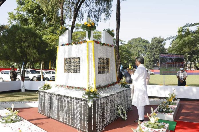 সারা দেশের সাথে রাজ্যেও আজ যথাযোগ্য মর্যাদায় পুলিশ স্মৃতি দিবস উদযাপিত হয়। আগরতলার অরুন্ধতীনগরস্থিত পুলিশ লাইনের মনোরঞ্জন দেববর্মা স্মৃতি স্টেডিয়ামে মূল অনুষ্ঠানের আয়োজন করা হয়। অনুষ্ঠানে মুখ্যমন্ত্রী প্রফেসর (ডা.) মানিক সাহা, কর্তব্যরত অবস্থায় যে সমস্ত পুলিশ ও সুরক্ষা বাহিনীর জওয়ানরা শহীদ হয়েছেন তাদের স্মৃতির প্রতি শ্রদ্ধা জানিয়ে স্মৃতি স্মারকে পুষ্পার্ঘ্য অর্পণ করে শ্রদ্ধা জ্ঞাপন করেন। এরপর মুখ্যসচিব জে কে সিনহা, রাজ্য পুলিশের মহানির্দেশক অমিতাভ রঞ্জন সহ পুলিশের অন্যান্য পদস্থ আধিকারিকগণ শ্রদ্ধাঞ্জলি অর্পণ করেন। পুলিশ স্মৃতি দিবস অনুষ্ঠানে ১ সেপ্টেম্বর, ২০২১ থেকে ৩১ আগস্ট, ২০২২ পর্যন্ত কর্তব্যরত অবস্থায় শহীদ হয়েছেন এমন ২৬৪ জন পুলিশ ও সুরক্ষা বাহিনীর জওয়ানদের প্রতি শ্রদ্ধা জানানো হয়। রাজ্য আরক্ষা দপ্তর আয়োজিত এই অনুষ্ঠানে সাংবাদিকদের সাথে কথা বলতে গিয়ে মুখ্যমন্ত্রী প্রফেসর (ডা.) মানিক সাহা বলেন, দেশের সার্বভৌমত্ব রক্ষায় উৎসর্গিত বীর জওয়ানগণের পরিবারের পাশে সরকার সবসময় থাকবে। পুলিশ আমাদের সমাজের অপরিহার্য অংশ। মানুষের জীবন সম্পত্তি রক্ষার্থে তারা দিনরাত নিয়োজিত থাকেন। তিনি বলেন, ১৯৫৯ সালের আজকের দিনে লাদাখে টহলরত ভারতীয় জওয়ানদের উপর চিনা সেনাবাহিনীর অতর্কিত হামলায় অনেক ভারতীয় জওয়ান শহীদ হন। সেই দিনটির স্মরণে পুলিশ স্মৃতি দিবস পালন করা হয়। মুখ্যমন্ত্রী বলেন, গত ১ বছরে দেশে কর্তব্যরত অবস্থায় ২৬৪ জন পুলিশ ও সুরক্ষা বাহিনীর জওয়ান শহীদ হয়েছেন। এরমধ্যে রাজ্য পুলিশের ইনচার্জ ইনস্পেক্টর সত্যজিৎ মল্লিক যিনি খোয়াইয়ে কর্মক্ষেত্রে দায়িত্ব পালন করতে গিয়ে শহীদ হয়েছেন। মুখ্যমন্ত্রী শহীদ ইনচার্জ ইনস্পেক্টর সত্যজিৎ মল্লিকের স্মৃতির প্রতি শ্রদ্ধা ও তার পরিবার পরিজনদের প্রতি সমবেদনা জ্ঞাপন করেন। তিনি বলেন, শহীদ সত্যজিৎ মল্লিকের অবদান কখনও ভুলবার নয়।