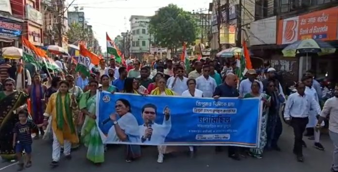 বিরোধী বামফ্রন্ট, এডিসির শাসক তিপ্রামথার পর এবার রাজধানীতে নিজেদের শক্তির মহড়া প্রদর্শন করল রাজ্য তৃণমূল কংগ্রেস। সোমবার রাজধানীর রাজপথে মহামিছিল করল তৃণমূল কংগ্রেস। এদিনের কর্মসূচীতে যোগ দিতে পশ্চিমবাংলা থেকে উড়ে আসেন পশ্চিমবাংলার তৃণমূলের দুই সাংসদ। এদিনের মহামিছিলটি শুরু হয় গান্ধীঘাটের সামনে থেকে। এদিনের মিছিলটি ফ্ল্যাক্স- পতাকায় সু- সজ্জিত মিছিল বিভিন্ন রাজপথে সাড়া ফেলে রবীন্দ্র ভবনের সামনে জনসভায় মিলিত হয়। এদিনের সভায় বক্তব্য রাখতে গিয়ে সাংসদ কাকলি ঘোষ দস্তিদার বিজেপির সমালোচনা করে বলেন, ২০২৩ বিধানসভা নির্বাচনে তৃণমূল প্রার্থীদের জয়ী করলেই হার্মাদ বাহিনীরা বিদায় নেবে। মানুষের জীবনে সুদিন আসবে। জনসভায় সাংসদ মহুয়া মৈত্র পশ্চিমবাংলায় তৃণমূল সরকারের রেশন স্কিম, লক্ষ্মি ভাণ্ডার, স্বাস্থ্য সাথী সহ বিভিন্ন প্রকল্প গুলি তুলে ধরে জানান কিভাবে মানুষ এর থেকে সুবিধা পাচ্ছেন। গুজরাট ও ত্রিপুরায় বিজেপি শাসিত রাজ্যে ধর্ষণের ঘটনা নিয়েও ডাবল ইঞ্জিন সরকারের সমালোচনা করেন। এদিনের কর্মসূচিতে উপস্থিত ছিলেন সাংসদ কাকলি ঘোষ দস্তিদার, সাংসদ মহুয়া মৈত্র, সাংসদ সুস্মিতা দেব, ত্রিপুরায় তৃণমূলের ইনচার্জ রাজীব ব্যানার্জিসহ অন্যান্যরা।