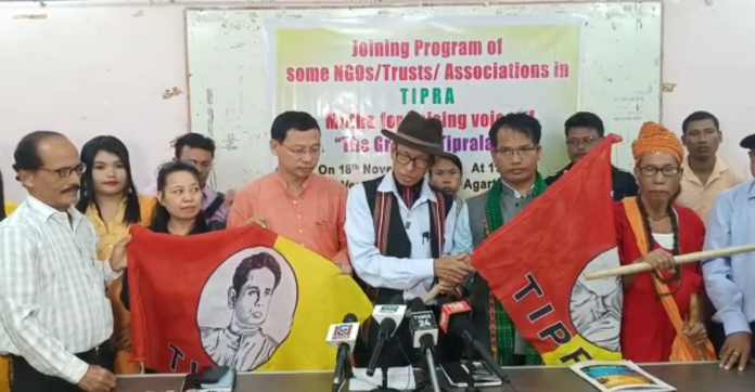 ২০২৩ বিধানসভা নির্বাচন যতই এগিয়ে আসছে ততই শক্তিশালী হচ্ছে এডিসি ক্ষমতাসীন দল তিপ্রামথা। এদিকে বিধানসভা নির্বাচন যত ঘনিয়ে আসছে ততই চলছে দলবদলের পালা। কোথাও শাসক দল ছেড়ে বিরোধী শিবিরে যোগ আবার কোথাও বিরোধী শিবির ছেড়ে যোগ দিচ্ছেন অনেকেই শাসক দলে। তারই পরিপ্রেক্ষিতে শুক্রবার আগরতলা প্রেসক্লাবে হয় একটি যোগদান পর্ব। এদিন সেখানে ২৪ টি এনজিও সহ বিভিন্ন লোকজন তিপ্রা মথায় যোগদান করেন । গ্রেটার তিপ্রাল্যান্ডের দাবিকে আরো জোরদার করতেই তাদের তীব্র মথায় যোগদান ।এদিন চব্বিশটি এনজিও সহ প্রায় ৫০০ জন লোক যোগদান করেন ।তাদের স্বাগত জানান দলের সভাপতি বিজয় কুমার রাঙ্খল, রাজনৈতিক সচিব রাজেশ্বর দেববর্মা সহ অন্যান্যরা। তাদের যোগদানে বিধানসভা নির্বাচনে আগে পাহাড়ে প্রদ্যুৎ কিশোরের শক্তি আরো বাড়ল বলে মনে করছেন রাজনৈতিক মহল।