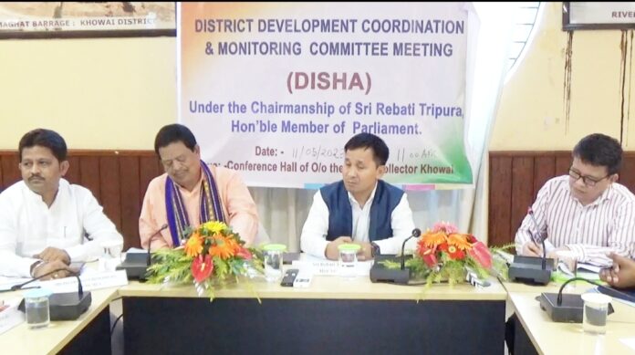 বৃহস্পতিবার দুপুরে খোয়াই জেলাশাসকের কনফারেন্স হলে পূর্ব ত্রিপুরা লোকসভা আসনের সাংসদ রেবতী কুমার ত্রিপুরার পৌরহিত্যে “দিশা” মিটিং অনুষ্ঠিত হয়। এই মিটিংয়ে সাংসদ ছাড়াও ছিলেন খোয়াই জেলা শাসক ডি কে চাকমা, খোয়াই জেলা সভাধিপতি জয়দেব দেববর্মা, বিধায়ক পিনাকী দাস চৌধুরী, বিধায়ক নির্মল বিশ্বাস, বিধায়ক রঞ্জিত দেববর্মা, অতিরিক্ত জেলাশাসকদ্বয় সহ ভিন্ন লাইন ডিপার্টমেন্ট দপ্তরের আধিকারিকরা। উক্ত বৈঠকে কেন্দ্রীয় ও রাজ্য সরকারের বিভিন্ন প্রকল্প গুলিকে বাস্তবায়নের বিষয় নিয়ে আলোচনা হয়। বৈঠক শেষে সংসদ রেবতী ত্রিপুরা জানান কেন্দ্রীয় ও রাজ্য সরকারের বিভিন্ন প্রকল্প বাস্তবায়নের বিষয়টিকে নিয়ে বিস্তারিতভাবে খতিয়ে দেখা হয়। তাছাড়া জনগণের প্রধান মৌলিক চাহিদা গুলি যেমন স্বাস্থ্য, পানীয় জল, রাস্তাঘাট ও বিদ্যুৎ পরিষেবার মান দ্রুত উন্নয়নের মাধ্যমে জনগণের কাছে পৌঁছে দেওয়া। তাছাড়া জাতীয় সড়কের কাজকর্মের বিষয়ে সড়ক নির্মাণকারী সংস্থার আধিকারিকদের সাথে আলোচনা করা হয় কাজের অগ্রগতির বিষয়ে যাতে করে অতি দ্রুত জাতীয় সড়কের কাজ দ্রুত সম্পন্ন করা হয়। এছাড়া সংসদ রেবতী কুমার ত্রিপুরা আরো অন্যান্য বিষয় গুলোকে নিয়ে পুঙ্খানুপুঙ্খভাবে জেলার বিভিন্ন আধিকারিকদের সাথে আলোচনা করেন যাতে করে সমস্ত ধরনের উন্নয়নমূলক কাজগুলিকে দ্রুত সম্পন্ন করা হয় এবং বিভিন্ন প্রকল্পের কাজগুলি যাতে সাধারণ মানুষের কাছে পৌঁছে যায় সেই বিষয়ে লক্ষ্য রাখার জন্য আবেদন রাখেন।