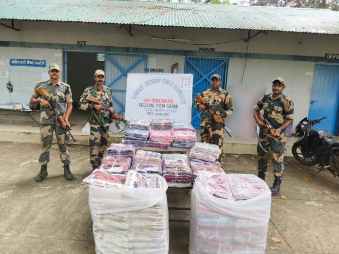 বাংলাদেশে পাচার কালে সীমান্ত রক্ষী বাহিনীর হাতে ধরা পরল ৯ লক্ষ ৫৯ হাজারটাকার দামি কাপড় খোয়াই পহরমুরা এলাকা থেকে।