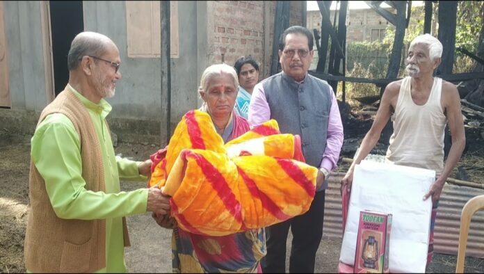 বাসুদেব ভট্টাচার্যী খোয়াই ১০ই ডিসেম্বর…গত তিন দিন আগে রবিবার সকালে খোয়াই সমতল পদ্মবিল গ্রাম পঞ্চায়েতের এক নং ওয়ার্ডের বাসিন্দা অনিল শুক্ল বৈদ্যের বসত ঘরটি বিদ্যুতের শর্ট সার্কিট থেকে আগুন লেগে পুরে ছাই হয়ে যায়। তাতে তাদের ১৫ লক্ষাধিক টাকার ক্ষয় ক্ষতি হয়েছে। তার মধ্যে ছিল নগদ অর্থ প্রায় আড়াই লক্ষ টাকা, কয়েক ভরি স্বর্ণালংকার, এমনকি ঘটনার একদিন আগে জমি থেকে পাঁচ কানি জমির ধান কেটে এনে স্তূপ করে সেই ঘরের বারান্দায় রাখা ছিল। তার সবকিছু সেই আগুনে পুড়ে ছাই হয়ে যায়। এই মর্মান্তিক ঘটনার খবর পেয়ে তাদেরকে সাহায্যের হাত বাড়িয়ে দিতে বুধবার দুপুর আনিল শুক্ল বৈদ্যের বাড়িতে উপস্থিত হয় রেড ক্রস সোসাইটি খোয়াই জেলার কর্মকর্তারা। তাদের পক্ষ থেকে ক্ষতিগ্রস্ত পরিবারের গৃহকর্তা অনিল শুক্ল বৈদ্যের হাতে কম্বল, ত্রিপাল, বাসনপত্র সহ বিভিন্ন জিনিসপত্র তুলে দেন। সেখানে উপস্থিত ছিলেন রেড ক্রস সোসাইটি জেলার সম্পাদক জয়ন্ত সাহা , চেয়ারম্যান কানাই শিল, বিশিষ্ট সমাজসেবী বিনয় দেববর্মা সদস্যা স্বরুপা দত্ত, সুস্মিতা রায় সহ অন্যান্যরা। রেডক্রস সোসাইটি খোয়াই জেলার সম্পাদক জয়ন্ত সাহা বলেন অগ্নিকাণ্ডের ঘটনার খবর পেয়ে তারা খুবই মর্মাহত । কারণ অগ্নিকাণ্ডের ফলে অনীল শুক্ল বৈদ্যের পরিবারের অপূরণীয় ক্ষতি হয়েছে। সেই ক্ষতি এবং মানসিক যন্ত্রণা থেকে উত্তরাতে তাদের অনেক সময় লাগবে। তাই রেডক্রস সোসাইটি খোয়াই জেলা কমিটির পক্ষ থেকে এই পরিবারের হাতে কিছু জিনিসপত্র তুলে দেওয়া হল গৃহকর্তা অনিল শুক্ল বৈদ্যের হাতে।