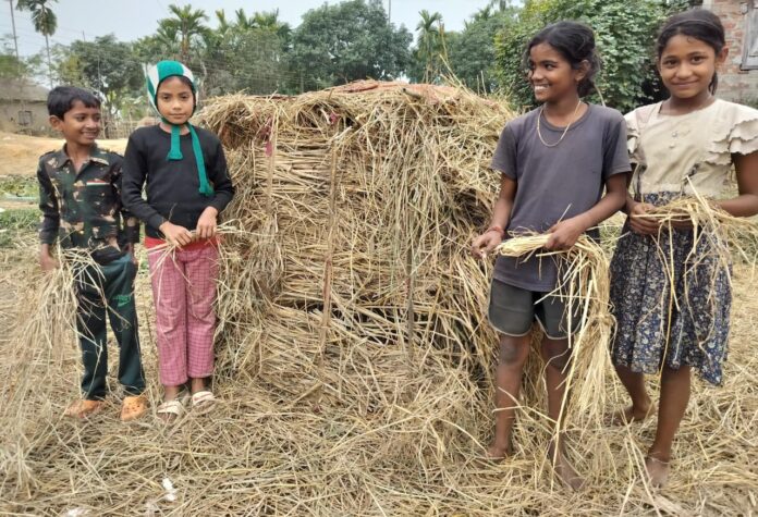 পৌষের শেষ প্রান্তে সংক্রান্তির আগমনী বার্তা নিয়ে কৃষ্ণপুরের বালুছরায় ধানের ক্ষেতে ফুটে উঠেছে এক অনন্য দৃশ্য। শীতের কোমল পরশে মোড়ানো এই ঋতুতে, প্রদীপ শীলের ধানের জমিতে গড়ে উঠেছে এক অভিনব আলন্তির ঘর আর তারই চারপাশে মেতে উঠেছে গ্রামের কচিকাঁচারা।