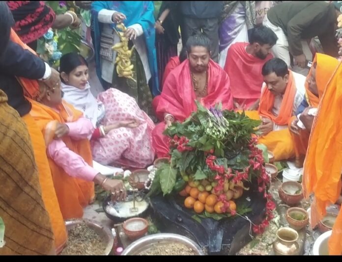 রবিবার দিনটি ছিল মহা শিবরাত্রি ব্রত পালনের দিন।এই দিনটিকে কেন্দ্র করে খোয়াই সিংঙ্গিছড়া এলাকার বাসিন্দা তাপস দেব সরকারের বাড়িতে অনুষ্ঠিত হল রাজ্য বাসির সুখ ,সান্তি,সমৃদ্ধির ও বৃদ্ধির লক্ষে সারারাত ব্যাপী মহাশিব রাত্রি রূদ্রাভিষেক। রাজ্যে এই প্রথম শিব ভক্ত বাবাজী শ্রী গুরুজী কিশোর গোস্বামীর পরিচালনায় ১০০৮ টি উপাদান দিয়ে শিবরাত্রির রাতে খোয়াই সিংঙ্গিছড়া স্থিত তাপস দেব সরকারের বাসভবনে অনুষ্ঠিত হল সারা রাত ব্যাপি শিবের রূদ্রাভিষেক অনুষ্ঠান। এইদিন এই পূন্য অভিষেক করা হয় সহস্র ধারা এবং ১০০৮ টি সামগ্রী দিয়ে। এরমধ্যে রয়েছে ৬৩ প্রকারের দুগ্ধ, ৫১প্রকার ফল,২৬৪টি সর্ব তীর্থের জল ও মাটি। এছাড়াও রয়েছে ৩৮৪ প্রকারের মহা ঔষধের জড়ি বুটি।১৮ টি নদীর জল সহ আটলান্টিক ও বঙ্গোপসাগরের জল কৈলাশের মানস সরোবরের জল সহ ২১ ঘাটের জল ও এই রূদ্রাভিষেকে ব্যবহার করা হয়।৬৯ প্রকারের নবরত্ন,১৬ প্রকারের রূদরাক্ষ,৮ প্রকারের ধাতু,৫১ প্রকারের মিষ্টি এবং ১০৮ প্রকারের বিভিন্ন শাকসবজি সহ সর্ন,রূপো, হীরা,মানিক্য ইত্যাদি দিয়ে শিবের রূদ্রাভিষেক করেন বাবাজী শ্রী কিশোর গোস্বামীর। রবিবার সন্ধ্যা সাতটায় এই রূদ্রাভিষেক শুরু হয় এবং শেষ হয় সোমবার সকাল ৭টা ৩০মিনিটে। অর্থাৎ টানা র১২ ঘন্টা ধরে চলে এই রূদ্রাভিষেক অনুষ্ঠানটি যা ছিল খোয়াই এর জন্য এক ঐতিহাসিক দিন।এই রূদ্রাভিষেক কে কেন্দ্র করে গত কয়েক দিন ধরে ব্যাপক প্রচার করাহয় এবং সমস্ত খোয়াই বাসির উপস্থিতি কামনা করেন।এই ঐতিহাসিক রূদ্রাভিষেক দেখতে রবিবার রাতে খোয়াই সিঙ্গিছড়া তাপস দেব সরকারের বাসভবনে সাধারণ জনগণ থেকে সুরু করে খোয়াই সহরের বিভিন্ন গন্যমান্য ব্যাক্তিবর্গরাও এই রূদ্রাভিষেক দেখতে ভিড় জমান। এর মধ্যে এই শিব রূদ্রাভিষেক অনুষ্ঠানে শিবের মাথায় জল ঢালতে উপস্থিত খোয়াই মন্ডল সভাপতি অনুকূল দাস।এছাড়া প্রাক্তন মন্ডল সভাপতি সুব্রত মজুমদার এবং পঞ্চায়েত সমিতির প্রাক্তন চেয়ারম্যান তাপস কান্তি দাস ও শিবের মাথায় জল ঢেলে আশির্বাদ গ্রহণ করেন।এই রূদ্রাভিষেক দেখতে রবিবার সন্ধ্যায় সেখানে উপস্থিত ছিলেন খোয়াই জিলা পরিষদের সভাধিপতি শ্রীমতি অপর্ণা সিংহ রায় সহ অন্যান্যরা। পাশাপাশি শিব ভক্তদের ভিড় ও চোখে পড়ার মতো। এই রূদ্রাভিষেক কে কেন্দ্র করে আগত সমস্ত ভক্তদের জন্য প্রসাদের ব্যবস্থা ও করা হয়েছিল। এই বিষয়ে বাবাজী শ্রী কিশোর গোস্বামী বলেন খোয়াই ও রাজ্যবাসীর সুখ সমৃদ্ধির স্বার্থে এই ধরনের বিশেষ শিবের রূদ্রাভিষেক অনুষ্ঠানটি কথা হয়।