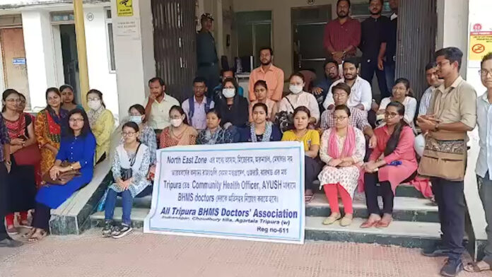 শুক্রবার অল ত্রিপুরা বি.এইচ.এম.এস ডক্টরস এসোসিয়েশনের পক্ষ থেকে প্যালেস কম্পাউন্ড স্থিত এন এইচ এম কার্যালয়ে গিয়ে এন এইচ এম-র এম ডি-র কাছে ৩ দফা দাবিতে ডেপুটেশন প্রদান করা হয়। কমিউনিটি হেলথ অফিসার পদে নিয়োগের কথা বলা  হচ্ছে গত দুই বছর ধরে। এই বিষয়ে জানতে প্রতিমাসে এসে এক দপ্তর থেকে অন্য দপ্তরে ঘুরতে হচ্ছে তাদের। শুক্রবার এম ডি ডেপুটেশন গ্রহণের জন্য সময় দিয়েছেন। তাই তার কাছ থেকে জানার চেষ্টা হবে গোটা পক্রিয়া সম্পর্কে। রাজ্যে ৫০০ উপর হোমিওপ্যাথী চিকিৎসক আছেন। সকলে উপস্থিত হবেন। কোন সদুত্তর না পেলে ধর্নায় বসার ঘোষণা দেয় অল ত্রিপুরা বি.এইচ.এম.এস ডক্টরস এসোসিয়েশন।