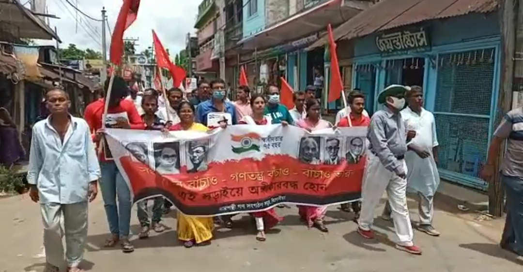 স্বাধীনতার ৭৫ তম বর্ষ উদাপন কে সামনে রেখে সংবিধান বাঁচাও,গনতন্ত্র বাঁচাও, বাঁচাও ভারত এর লড়াইয়ে অঙ্গীকার বদ্ব হোন এ আহ্বান কে সামনে রেখে সোমবার দুপুর ১২ টা নাগাদ সিপিআইএম বিলোনিয়া মহকুমা কার্যালয় থেকে বামফ্রন্টের বিভিন্ন গনসংগঠনের ডাকে এক গর্জমান মিছিল সংগঠিত করে। মিছিলে ছাত্র,যুব,নারী,কৃষক, শ্রমিক, তপশিলি ,প্রত্যেক টি গনসংগঠন তাদের সংগঠনের নির্দিষ্ট দাবির ব্যানার নিয়ে এ দিনের মিছিলে সামিল হয়। দ্রব্যমূল্য বৃদ্বি,শিক্ষার বেসরকারি করন, নারী অধিকার খর্ব,শ্রম কোড বাতিল করা সহ আরো অন্যান্য দাবি নিযে তীব্র প্রতিবাদে সামিল হয বামপন্থী বিভিন্ন গনসংগঠন গুলি।গনসংগঠনের বিভিন্ন রং এর পতাকা হাতে নিয়ে অসংখ্য নারী পুরুষ, যুব থেকে শুরু করে বিভিন্ন গনসংগঠনের কর্মী সমর্থক রা উপস্থিত হয়।মিছিল টি পুরাতন মটরষ্ট্যন্ড, ব্যাংক রোড,এক নং টিলা হয়ে হাসপাতাল চৌমুহনী, সিনেমা হল, বিদ্যাপীঠ কর্নার ঘুরে পুনরায় সিপিআইএম বিলোনিয়া মহকুমা কার্যালয়ের সামনে শেষ হয়,সেখানে সিপিআইএম বিলোনিয়া মহকুমা সম্পাদক তাপস দত্ত স্বাধীনতা আন্দোলনের প্রেক্ষাপট টেনে স্বাধীনতা আন্দোলনে কমিউনিস্ট দের ভুমিকা নিয়ে বিস্তারিত ভাবে তুলে ধরেন, তিনি আরো বলেন স্বাধীনতার প্রাপ্তি ও প্রত্যাশার ব্যাবধান ঘোচাতে গন মিছিলে সামিল হোন ১৯৪২ সালে ভারত ছাড় আন্দোলন যে ঐতিহাসিক আন্দোলন যে আন্দোলন আমাদের দেশে স্বাধীনতা আন্দোলনে গুরুত্বপূর্ণ মহিমা বহন করে এবং ১৯৪৭ সালে স্বাধীনতা আন্দোলনের পরবর্তী সময়ে স্বাধীনতার প্রাপ্তি প্রত্যাশাএ দুইয়ের ব্যাবধানে আজ ৭৫ তম স্বাধীনতা আমরা উদযাপন করব তারই প্রস্তুতি চলছে গোটা দেশজুড়ে, এই গনমিছিলে স্বাধীনতা আন্দোলনে বিশেষ করে কমিউনিস্ট পার্টি যে গুরুত্বপূর্ণ ভূমিকা বহন করেছিল তাদের প্রতিকৃতি কে সঙ্গে নিয়ে হবে মিছিল। মিছিলে ছিলেন সিপিআইএম দক্ষিণ জেলা সম্পাদক বাসুদেব মজুমদার মহকুমা সম্পাদক তাপস দত্ত রাজ্য কমিটির সদস্য দীপংকর সেন, নারী নেত্রী শেফালী মজুমদার, শ্রমিক নেতা বিজয় তিলক, ত্রিলোকেশ সিনহা, প্রাক্তনযুব নেতা রিপু সাহা, কৃষক নেতা বাবুল দেবনাথ, নারী নেত্রী অনিন্দিতা সাহা সহ বিভিন্ন গনসংগঠনের নেতৃত্ব কর্মি সমর্থকরা।