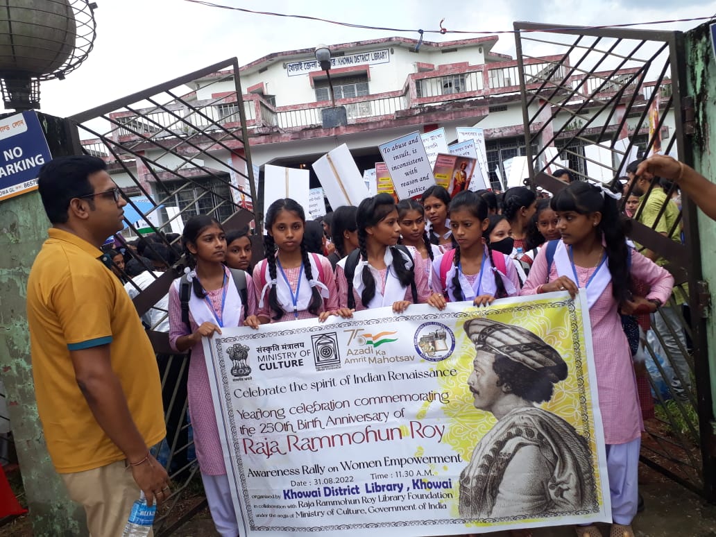 ভারত সরকারের সংস্কৃতি মন্ত্রনালয়ের অধীন রাজা রামমোহন রায় লাইব্রেরি ফাউন্ডেশন ও রাজ্য উচ্চশিক্ষা দপ্তরের সহায়তায় খোয়াই জেলা গ্রন্থাগার আয়োজিত আধুনিক ভারতের কিংবদন্তি সমাজ সংস্কারক রাজা রামমোহন রায়ের আড়াইশত বর্ষ জন্মবার্ষিকী উদযাপন অনুষ্ঠান। এই দিন এক বর্ণময় রেলির মাধ্যমে অনুষ্ঠিত হয়ে গেল খোয়াই জেলা গ্রন্থাগারে। 31শে অগাস্ট- বুধবার 2022ইং সকাল এগার ঘটিকায় খোয়াই জেলা গ্রন্থাগারে এক আড়ম্বর অনুষ্ঠানের মাধ্যমে মঙ্গল প্রদীপ প্রজ্জ্বলন করে উক্ত অনুষ্ঠানের শুভ সূচনা করেন অনুষ্ঠানের উদ্বোধক তথা প্রধান অতিথি খোয়াই পৌরপরিষদের মাননীয় চেয়ারপার্সন শ্রী দেবাশিস নাথশর্মা মহোদয়। বিশেষ অতিথি হিসেবে উপস্থিত ছিলেন যথাক্রমে খোয়াই পৌরপরিষদের মাননীয় কাউন্সিলর শ্রী পীযূষকান্তি চৌধুরী, শ্রী শন্কুপাল মহোদয় ও খোয়াই জেলা সাংস্কৃতিক উপদেষ্টা কমিটির সদস্য শ্রী দীপঙ্কর ভট্টাচার্য মহোদয়। উক্ত অনুষ্ঠানে সভাপতিত্ব করেন খোয়াই জেলা শিক্ষা আধিকারিক শ্রী সমরেন্দ্রনাথ দাস মহোদয়। বিশেষ অতিথিসহ বিভিন্ন বিদ্যালয় থেকে আগত সন্মানিত শিক্ষক- শিক্ষয়িত্রীমন্ডলী ও শিক্ষানুরাগী বিভিন্ন ব্যক্তিবর্গ ছাত্র ছাত্রী সহ সবাই মহান মানবতাবাদী রাজা রামমোহন রায়ের প্রতিকৃতিতে ফুলমালা দিয়ে শ্রদ্ধা জ্ঞাপন করেন। তারপর অনুষ্ঠানে স্বাগত বক্তব্য রাখেন খোয়াই জেলা গ্রন্থাগারের গ্রন্থাগারিক শ্রী জহরলাল দাস। এরপর রাজা রামমোহন রায়ের জীবন ও কর্মধারা উপর বিস্তৃত বক্তব্য রাখেন খোয়াই পৌরপরিষদের মাননীয় চেয়ারপার্সন শ্রী দেবাশিস নাথশর্মা মহোদয়। অনুষ্ঠানের সভাপতি তথা খোয়াই জেলা শিক্ষা আধিকারিক শ্রী সমরেন্দ্রনাথ দাসের বক্তব্যের মধ্যে দিয়ে উদ্বোধনী পর্বের সমাপ্তির সাথে সাথে শুরু হয় খোয়াই-এর বিভিন্ন বিদ্যালয়ের পাঁচ শতাধিক ছাত্রীদের নিয়ে এক জনসচেতনতামূলক বর্নাঢ্য রেলী। রামমোহনের বিভিন্ন বানী সম্বলিত প্ল্যাকার্ড, ফেস্টুন ও সানসেট সহ ছাত্রীদের এই রেলিটি খুবই দৃষ্টি নন্দন ছিল। নারী সশক্তিকরন তথা নারী ক্ষমতায়ন শীর্ষক জনসচেতনতা রেলিতে পা মেলান অনুষ্ঠানের উদ্বোধক তথা প্রধান অতিথি খোয়াই পৌরপরিষদের মাননীয় চেয়ারপার্সন শ্রী দেবাশিস নাথশর্মা মহোদয়, খোয়াই পৌরপরিষদের মাননীয় কাউন্সিলর শ্রী পীযূষকান্তি চৌধুরী,শ্রী শন্কুপাল সহ বিভিন্ন বিদ্যালয়ের শিক্ষক শিক্ষয়িত্রী বৃন্দ ও খোয়াই- এর সাংস্কৃতিক ও শিক্ষানুরাগী বিভিন্ন ব্যক্তিবর্গ । খোয়াই শহরের বিভিন্ন পথ পরিক্রমা করে রেলিটি আবার জেলা গ্রন্থাগারে শেষ হয়। দীর্ঘদিন পর সংস্কৃতি শহর উনবিংশ শতাব্দীর এক মহামানবের শ্রদ্ধা জ্ঞাপন অনুষ্ঠান প্রত্যক্ষ করল খোয়াই বাসি।